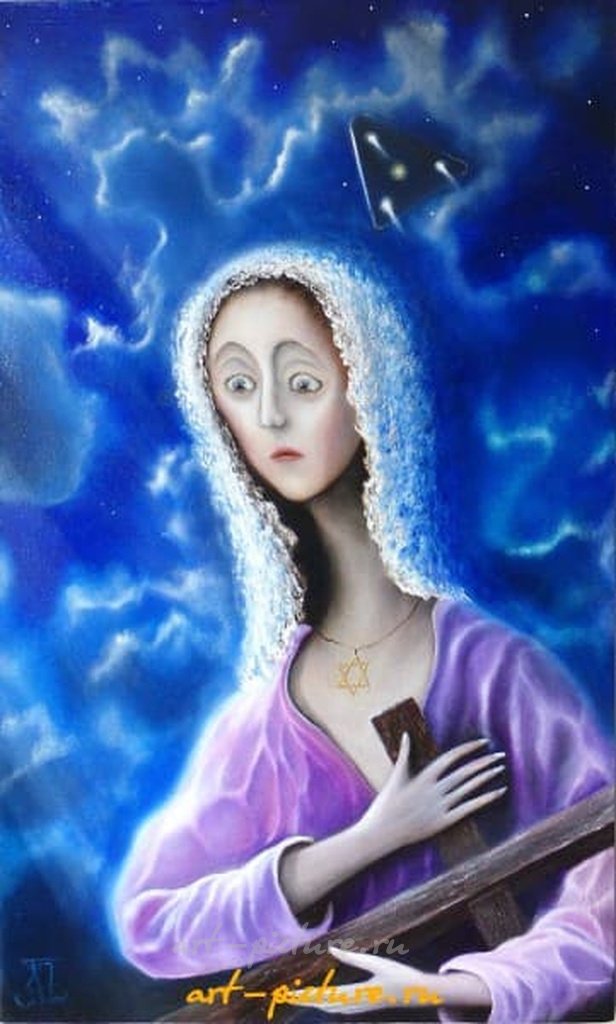 Как будто сама ночная тишина шепчет свои тайны этой женщине. Фиолетовое одеяние и звезда на груди придают ей особую загадочность. Хотелось бы узнать, о чем она думает, глядя на звездное небо.