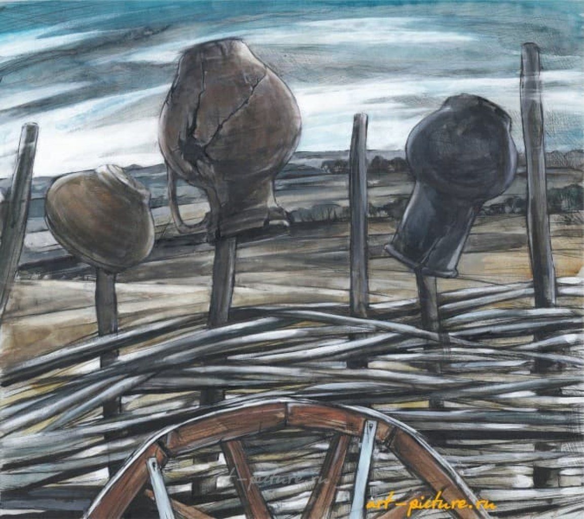 "Война прошла через станицу" из серии картин "Казачья Слава" акварель, тушь, белила, тонированная бумага
