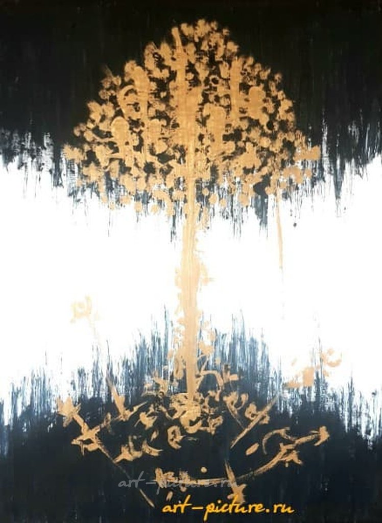 Что за задумка у художника? Дерево как символ жизни и роста в таком абстрактном виде выглядит очень неожиданно. Золото на фоне черного и белого дает энергию, но вот эта размытость ветвей вызывает мысли о непостоянстве и изменчивости. Интересно, что каждый увидит в этом своем!