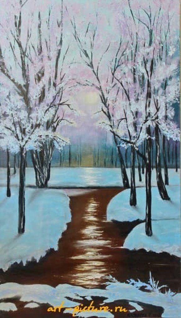 Эта зимняя пейзажная картина удивляет своей гармонией холодных и теплых оттенков. Речка, как центральная ось, поэтично вводит в загадочный лес, создавая ощущение покоя и умиротворения. Солнечные лучи, игриво отражающиеся на воде, добавляют волшебства и придают сцене атмосферу сказки.