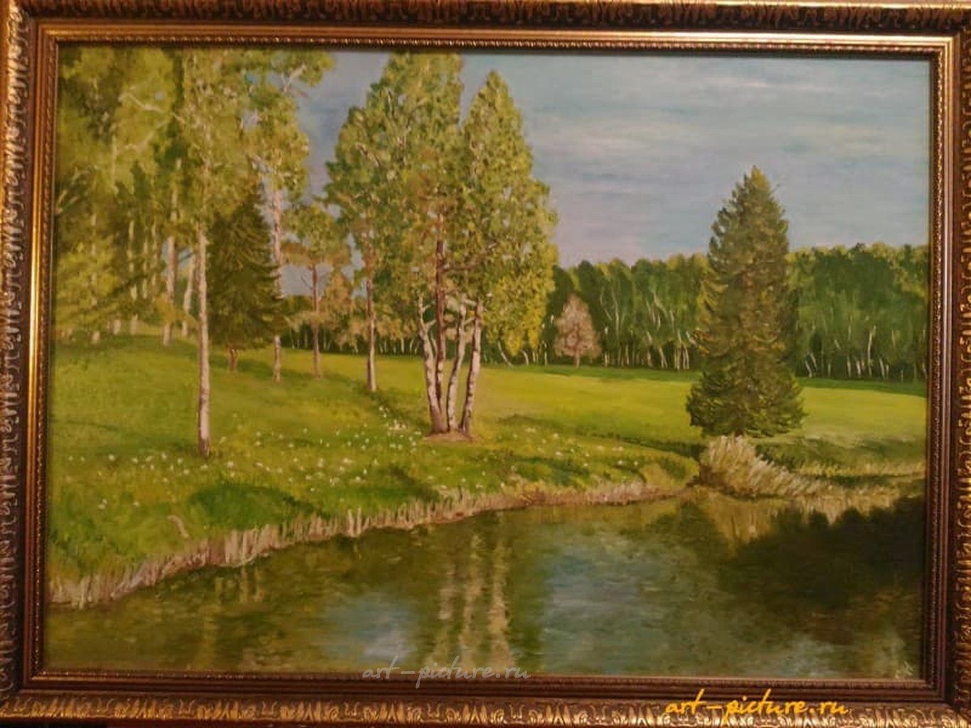 Какое прекрасное и умиротворяющее изображение! Эта картинка словно переносит нас в сердце природы, где каждое дерево и река наполняют душу спокойствием. Золотистая рама лишь подчеркивает всю красоту лета и гармонию окружающего мира.