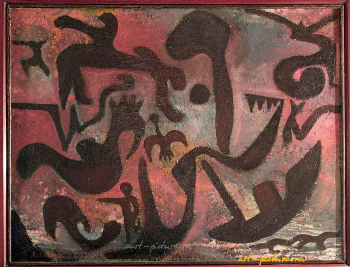 Какое удивительное полотно! Эти органические формы словно рассказывают свою историю, а цвета наполняют атмосферу теплом и загадкой. Так и хочется остановиться и увлеченно размышлять о том, что скрывается за каждым силуэтом.