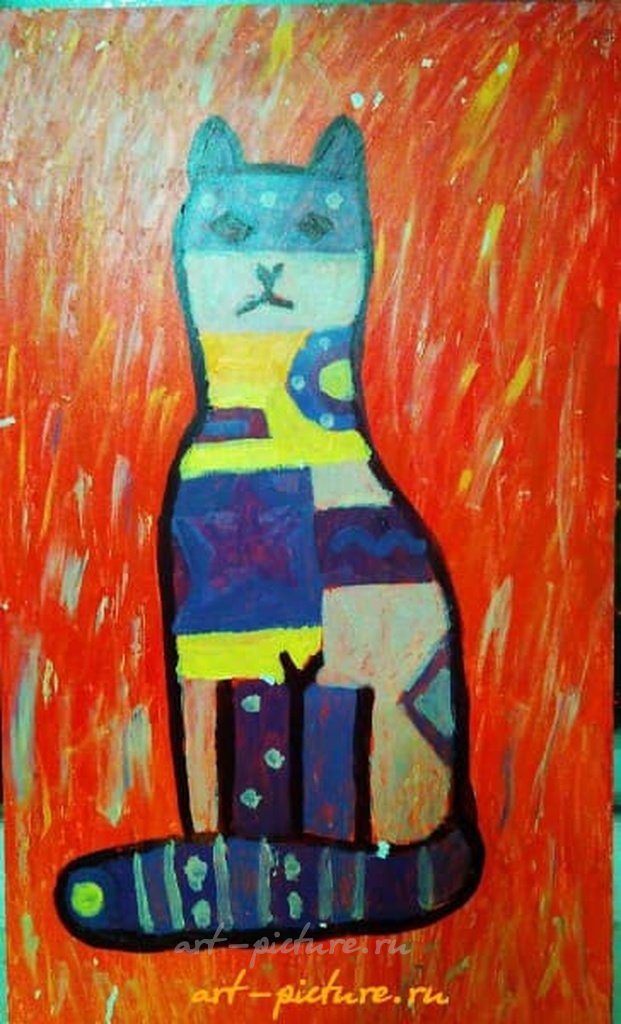 Крутая работа! Комбинация ярких цветов и геометрических форм на кошке создает удивительный эффект, а фон действительно добавляет динамики. Прямо чувствуешь, как эта кошка оживает на палитре!