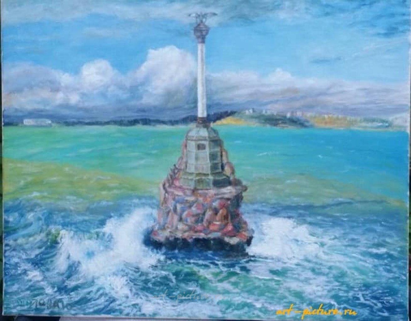 Памятник затопленным кораблям в Севастополе — это мощный символ мужества и жертвенности. Яркие голубые и зелёные тона картины прекрасно передают динамику морской стихии, создавая ощущение величия и силы природы. Такое искусство напоминает нам о важности истории и её сохранения в нашем сознании.