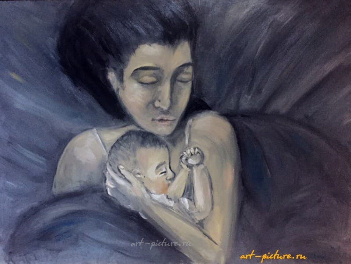 Как замечательно передано это чувство тепла и защищенности! Закрытые глаза говорят о том, насколько глубокое доверие существует между матерью и ребёнком. Нежные оттенки только усиливают это умиротворение — настоящий шедевр!