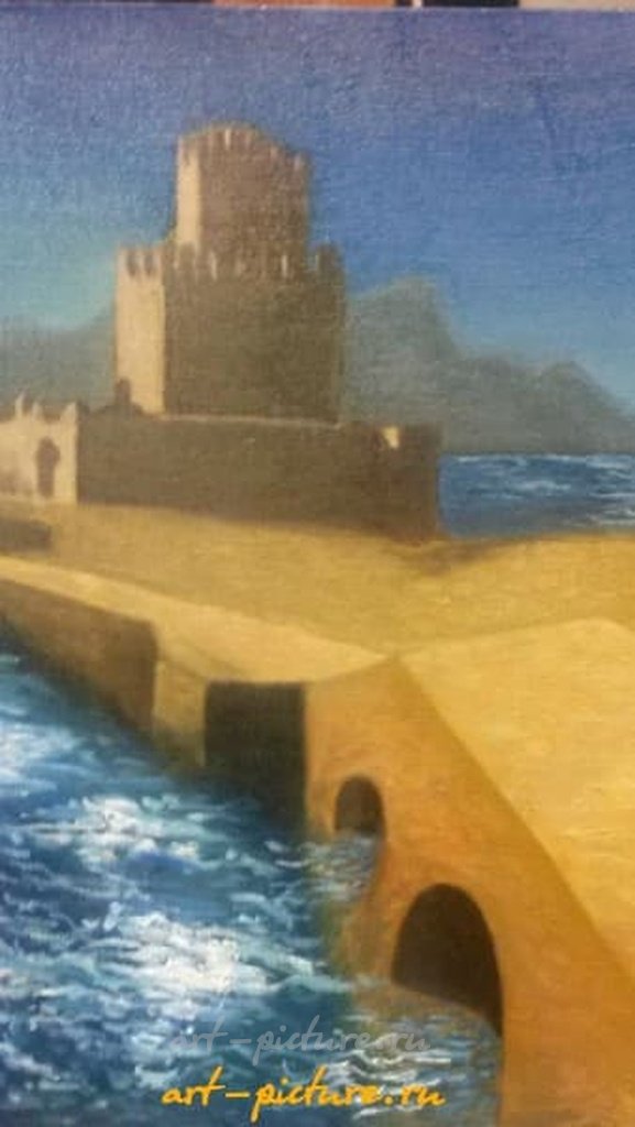Эта картина просто завораживает! Особенно впечатляют арки, под которыми проходит вода — создается ощущение, что fortress словно охраняет побережье от волн. А контраст между земными тонами и ярким небом делает произведение живым и притягательным.