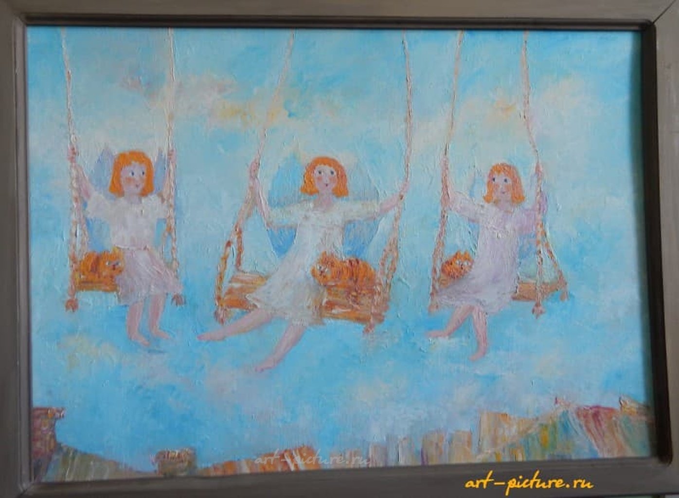 Картина родилась, как ассоциация на незатейливые стихи - Все ангельские души витают в облаках И в солнечных картинах И в солнечных стихах. Находят пониманье, особое вниманье В таких же очень светлых Таинственных котах. Витают и витают, Кого-то раздражают, Кого-то вдохновляют На подвиг и на труд... Но всех нас - уверяю! Земную нашу стаю - Бескрылую, крикливую, Недобрую, ленивую, Всех нас, несовершенных, Как могут, берегут! Картина написана с любовью и добром.