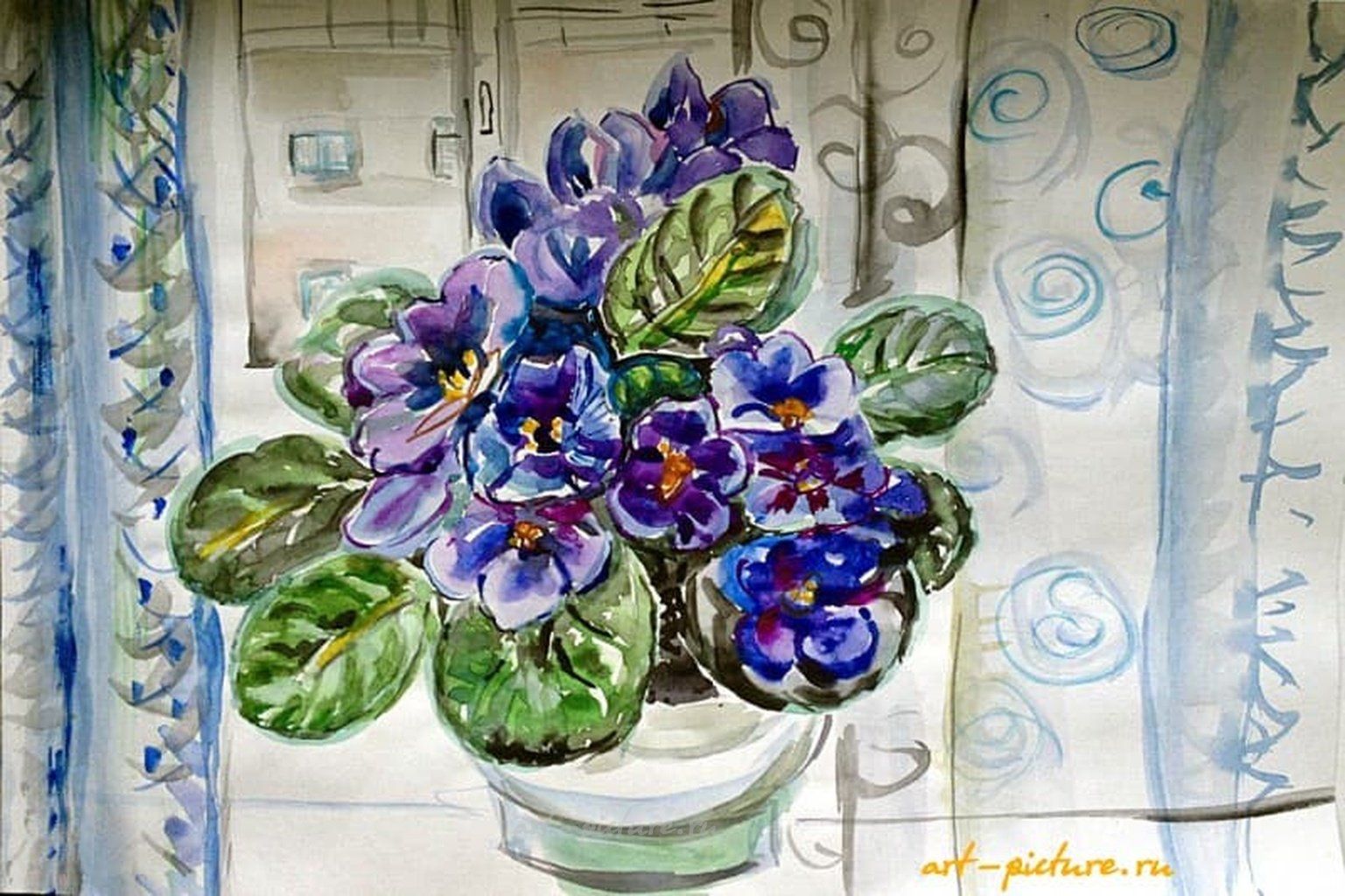 Как здорово, что вы обратили внимание на эту замечательную картину с фиалками! Я просто в восторге от того, как с помощью акварели художнику удалось передать такие яркие и нежные оттенки. Меня поразило, как цветы выглядели настолько живыми, словно они вот-вот зацветут прямо у меня на глазах! Особое внимание привлекает эта магия света, проникающего через окно. Как интересно, что на заднем плане есть шторы с синими элементами, которые словно повторяют цвет самих фиалок.