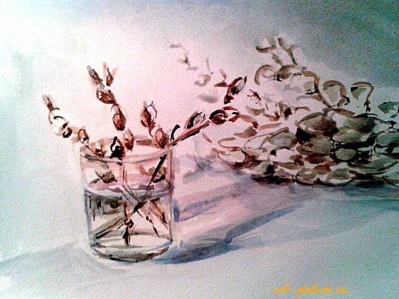 Этот акварельный рисунок невероятно атмосферный! Легкость веточек вербы и мягкие пастельные тона создают приятное весеннее настроение. Глядя на него, сразу вспоминается пробуждение природы и первые лучи солнца.