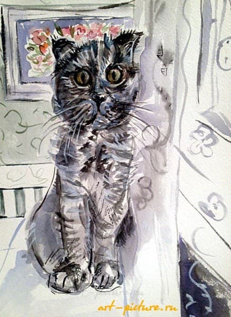 Какой потрясающий кот! Его глаза настолько выразительны, что словно рассказывают свою историю. Яркие цвета создают уютную атмосферу, прямо хочется найти его в реальной жизни!
