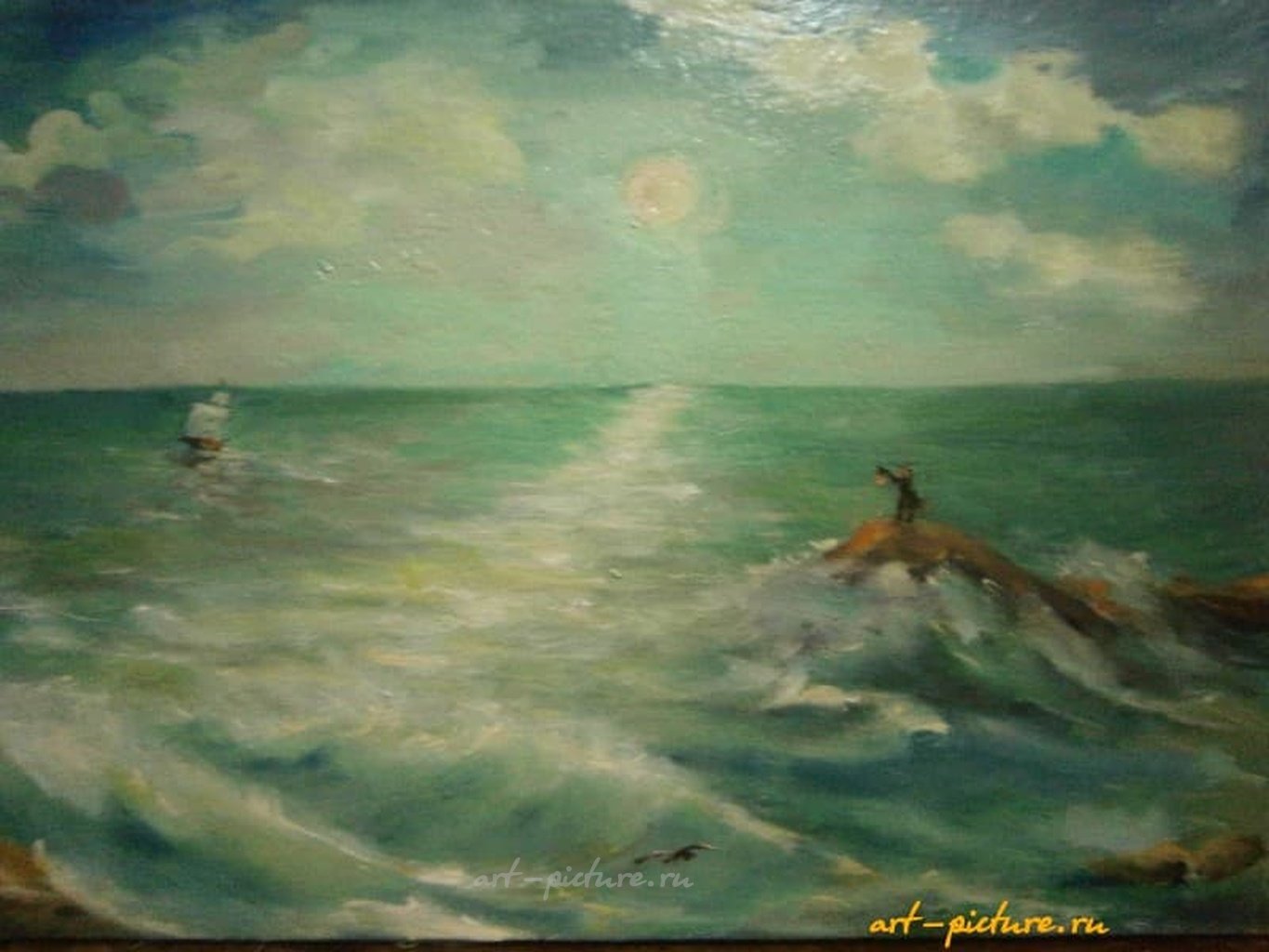 Какой прекрасный морской пейзаж! Парусник гармонично вписывается в композицию, придавая ощущение движения и свободы. Человек на скале словно приглашает нас задуматься о том, что скрыто за горизонтом, напоминая о бескрайних возможностях, которые открывает море.
