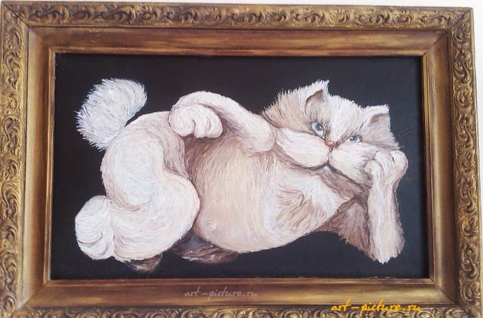 Какой милый и уютный образ! Кот, лежащий на спине, выглядит совершенно расслабленным и невозмутимым, словно наслаждается моментом. Работа с деталями шерсти впечатляет, а задумчивый взгляд придаёт картине особую атмосферу спокойствия.