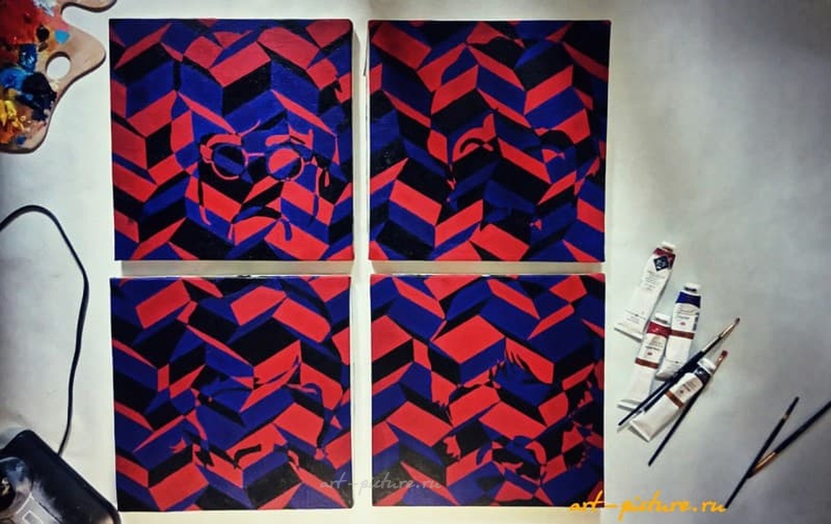 Как же интересно, как геометрические формы и цветовые контрасты могут объединять элементы и создавать целостное восприятие! Каждая картина словно предлагает свою интерпретацию образа, а вместе они вызывают ощущение тайны. Мастерская художника действительно кажется местом, где рождаются настоящие шедевры!