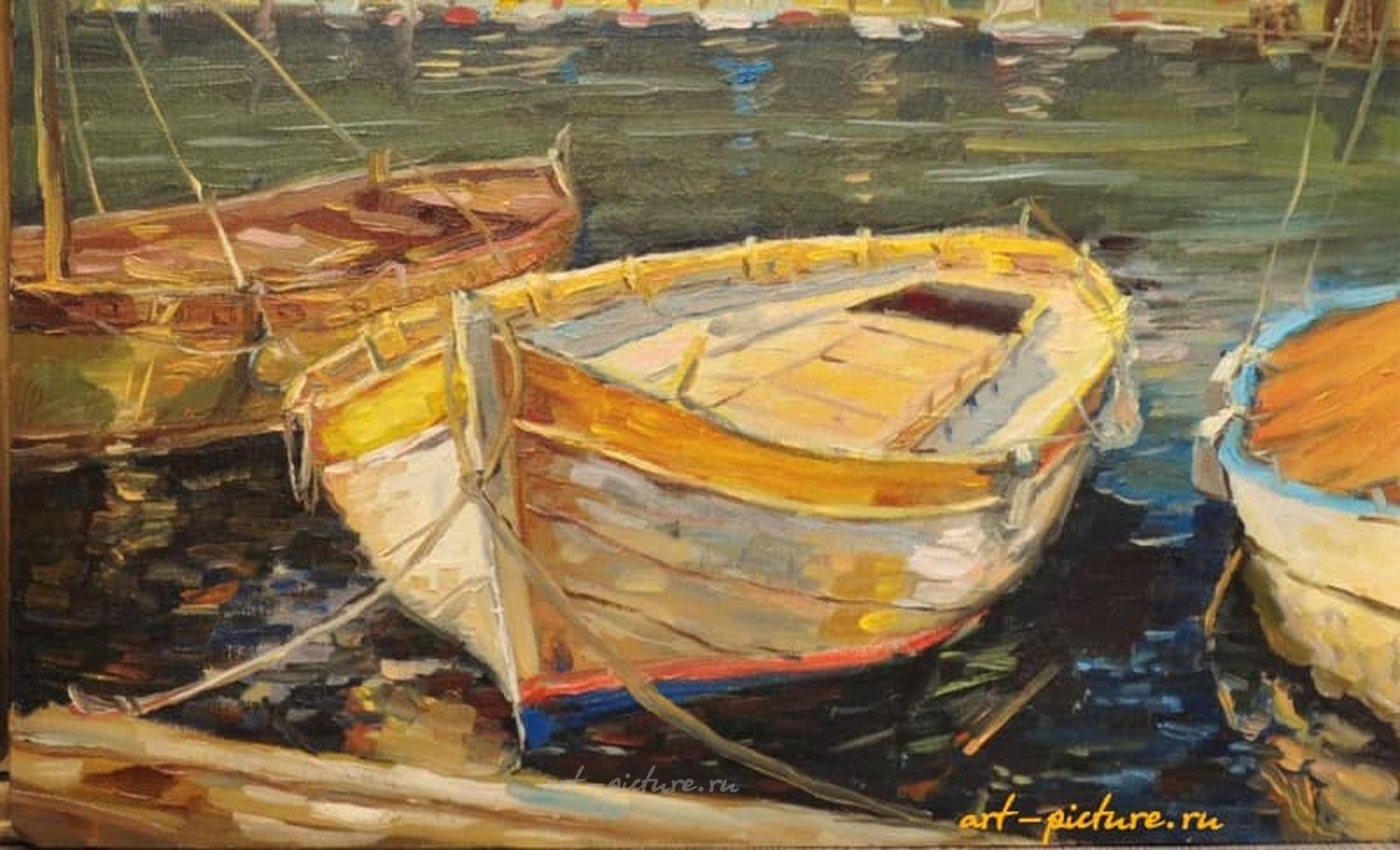 Ваша просьба о детальном обсуждении стиля и характерных черт описанного предмета распахивает передо мной двери к безбрежным просторам мысли, стремящейся завоевать искусство и красоту. Позвольте мне остановиться на удивительном взаимодействии цвета, формы и света в живописи, о которой мы только что обсудили, а именно о картине, изображающей лодку, привязанную к причалу.
