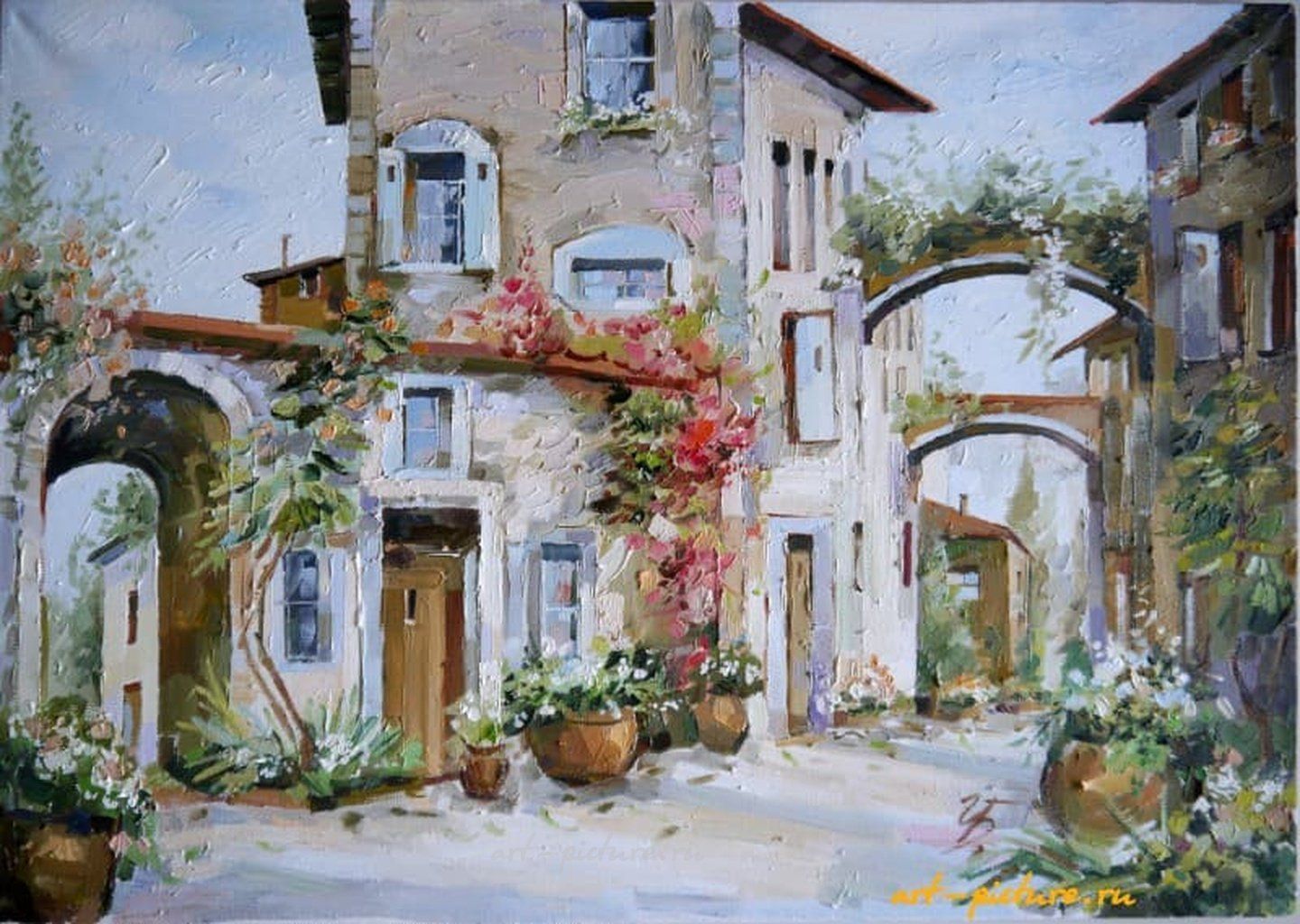 Когда пишут о живописи, особенно о столь интересной, как описанная вами картина, можно буквально ощутить атмосферу этого южного городка! Я сам часто гуляю по таким улочкам с арками и зелеными растениями, и, если честно, в такие моменты сердце наполняется теплом и спокойствием. Есть в этом сочетании архитектуры и природы что-то магическое, не правда ли?