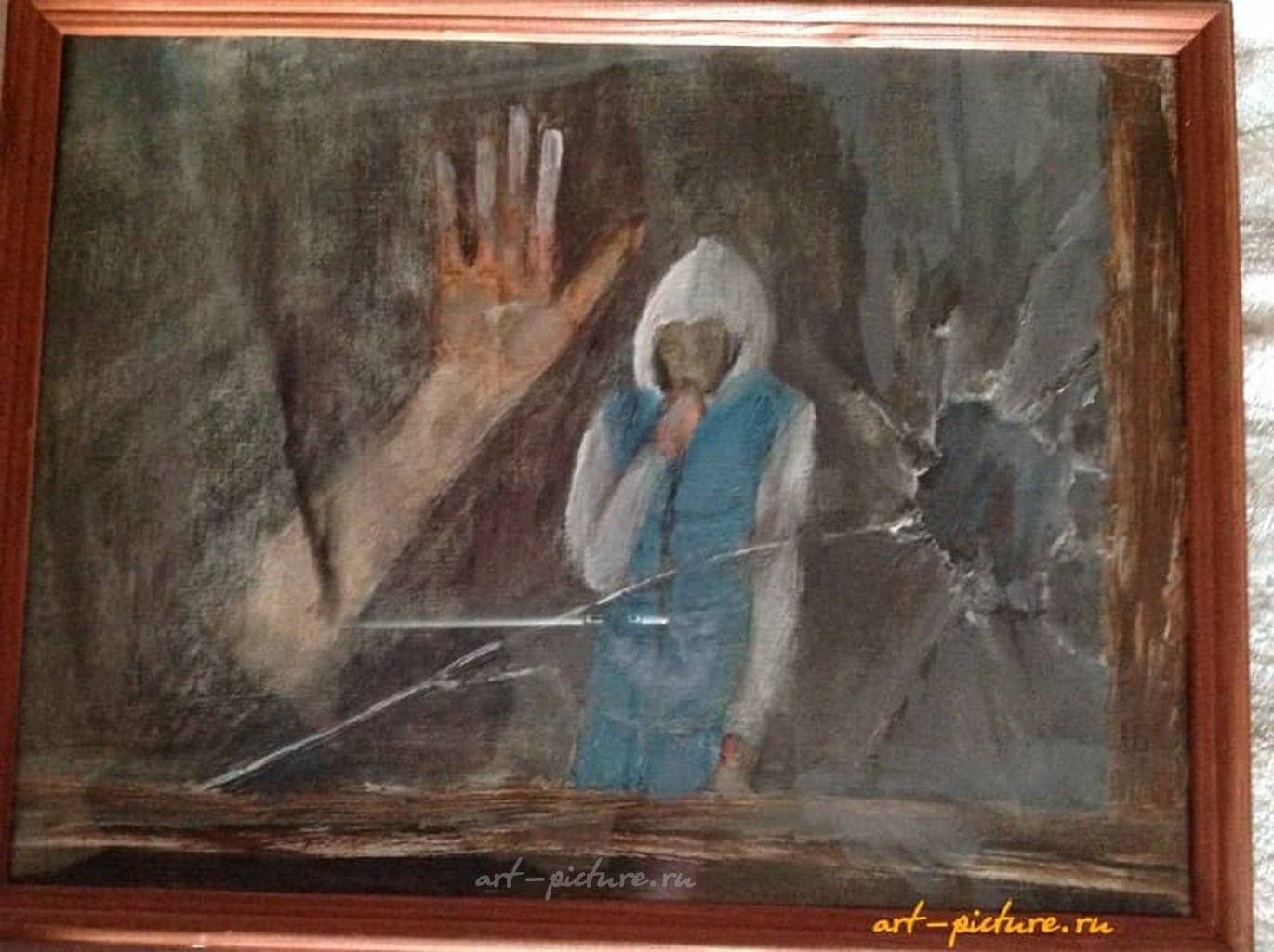 Картина впечатляет своей глубиной и атмосферой. Фигура в капюшоне вызывает ощущение загадки и внутренней борьбы, а трещина на стекле словно символизирует разрушение и недоступность. Тёмные оттенки добавляют драматизма, заставляя задуматься о смысле и эмоциях, скрывающихся за этой задумчивой позой.