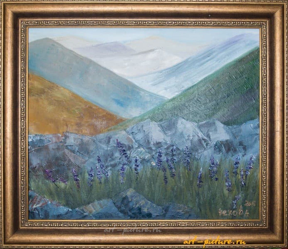 Какой прекрасный пейзаж! Эти фиолетовые цветы на переднем плане создают невероятный контраст с масштабом гор на фоне. Нравится, как художник передал игру света и тени, это действительно душевно!