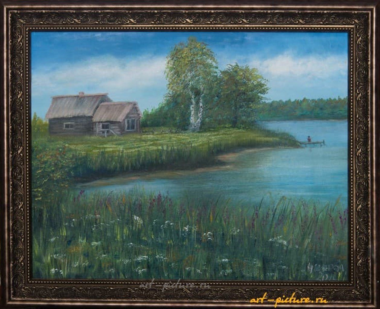 Как же уютно выглядит этот сельский пейзаж! Деревянный домик и озеро с отражением неба создают атмосферу спокойствия, словно время здесь остановилось. А лодка на воде добавляет жизни и заставляет задуматься о приятных моментах на природе.