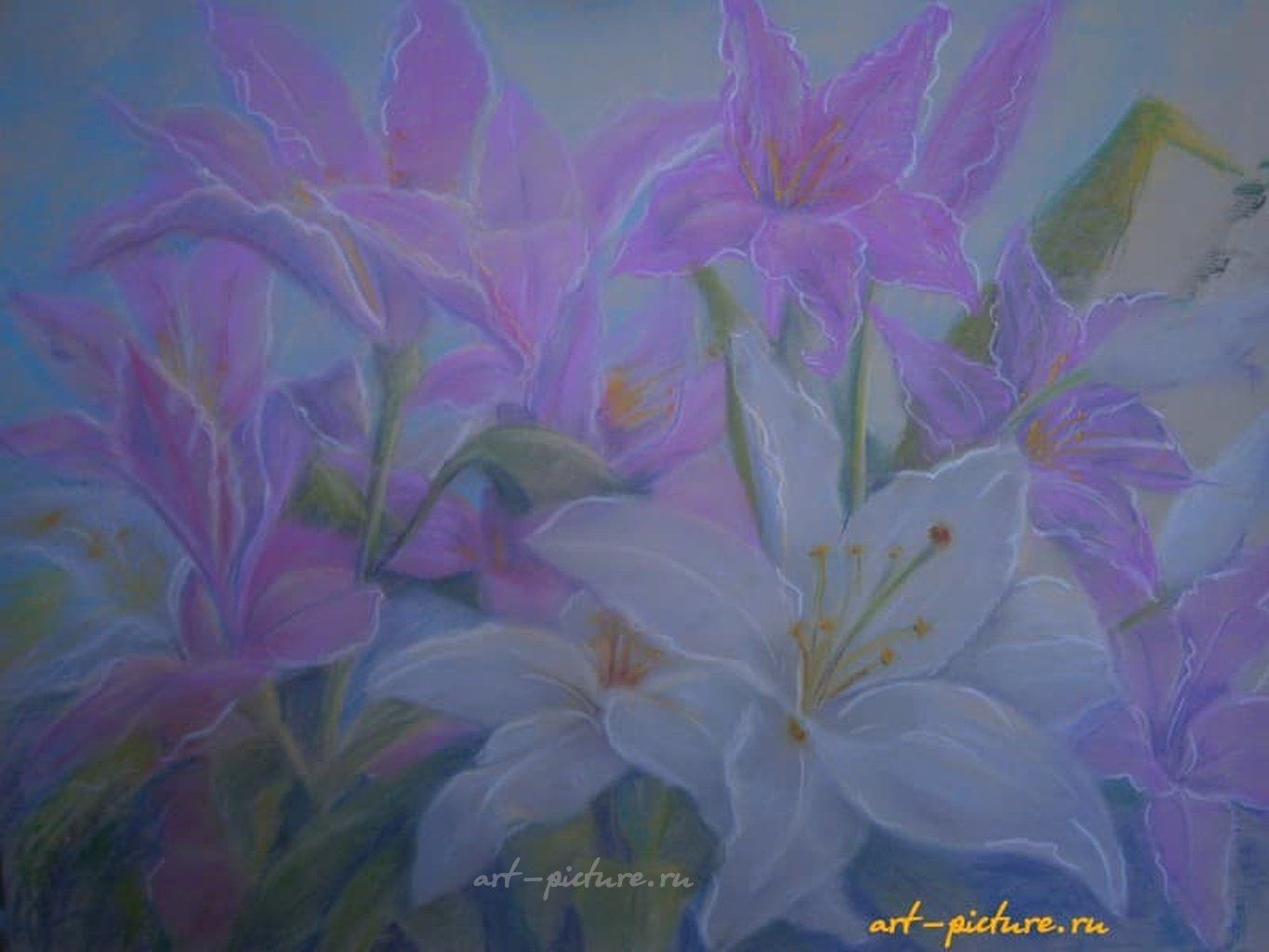Ах, как же мне приятно погрузиться в мир невероятной красоты и изяществ, описывая то, что пробуждает во мне настоящие эмоции и вдохновение! Данная работа, изображающая изысканный букет лилий, исполненная в нежных пастельных тонах, просто завораживает. Яркие сиреневые и белые цветы практически оживают на холсте, каждое движение кисти передает глубину и эмоциональную насыщенность, которая так притягательна. Не могу не отметить, как удачно автор смог создать контраст между этими двумя оттенками, позволив каждому цветку выделяться, словно они живые, пронзающие своим ароматом окружающее пространство.