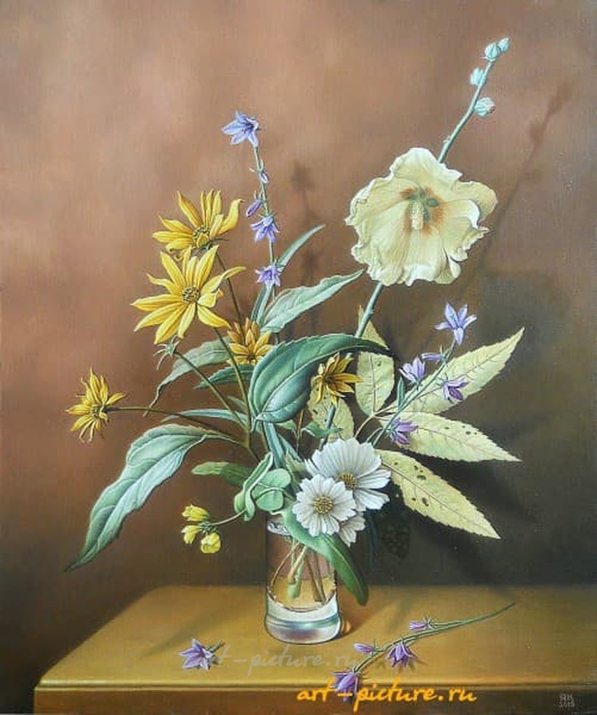 Какой замечательный натюрморт! Эти яркие полевые цветы привносят в композицию ощущение жизни и радости. Тёплые коричневые тона фона только усиливают это ощущение уюта — просто не могу оторвать взгляд!