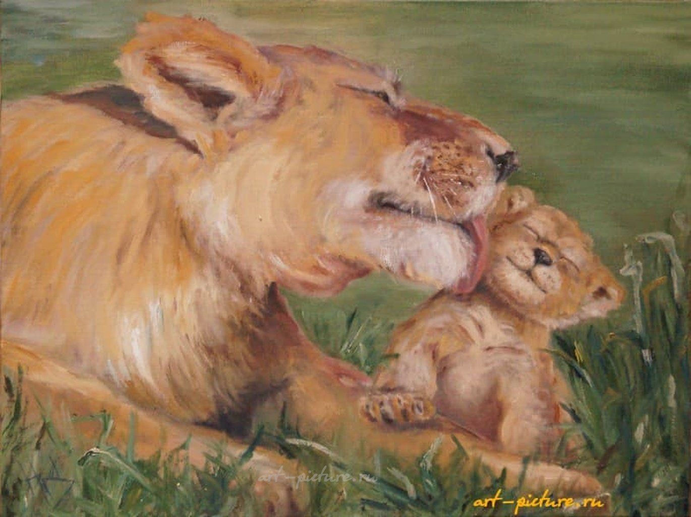 Начнем с картины, на которой изображены львицы. Восхитительная сцена, где взрослая львица заботится о своём детёныше, наполняет сердце теплом и спокойствием. Я всегда восхищался искусством, которое умело передавать такие нежные моменты волшебства природы. Эта картина словно пронизана жизнью, подчеркивающей мать и её дитя. Вдохновляющие цвета и текстура масляной живописи создают незабываемый визуальный эффект. Кстати, такая форма выражения чувств через изображение животных всегда меня удивляла. У животных есть такая способность передавать эмоции, которых нам порой не хватает в нашей повседневной жизни. Что вы думаете об этом? Как вы чувствуете ту любовь и заботу, которые излучают эти существа?