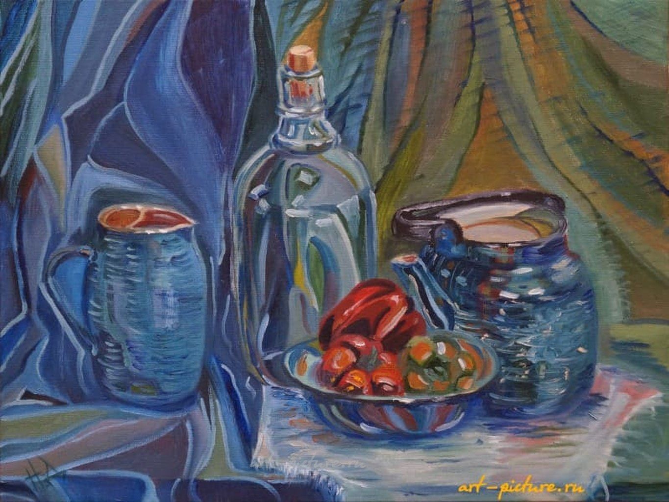 Как прекрасно, когда простые вещи могут так гармонично сочетаться! Эта картина действительно излучает уют и тепло, а яркие перцы на переднем плане добавляют жизни. Интересно, что свет, играющий на бутылке, создаёт ощущение волшебства в повседневности.