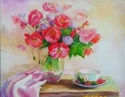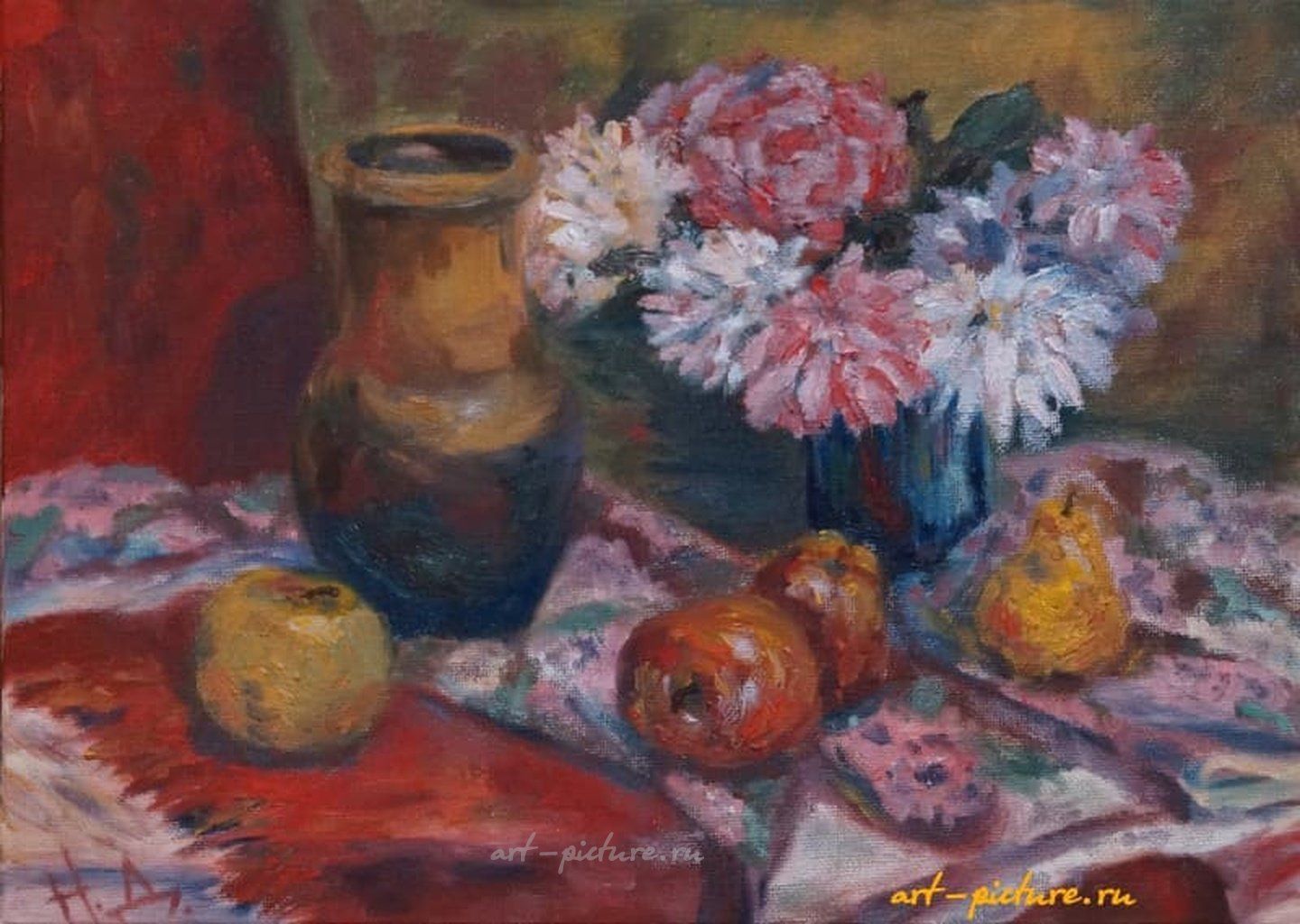 Как же приятно видеть такую уютную композицию! Фрукты и цветы создают атмосферу домашнего тепла, а теплые оттенки фона добавляют нотки спокойствия. Эта картина будто приглашает нас насладиться мгновением радости и гармонии.