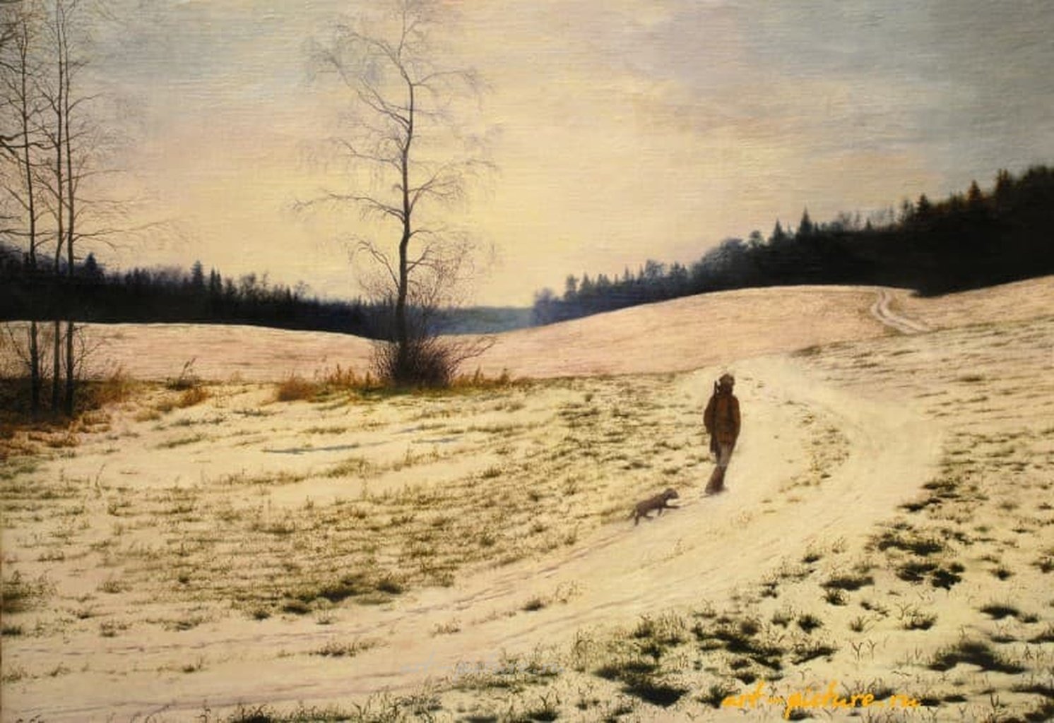 Таким образом, эта картина — не просто изображение, это приглашение к размышлениям. Простота скромного мужчину и его верного спутника вызывает у меня желание погрузиться в какую-то просветленную зимнюю тишину и заново открыть в себе ту искреннюю связь с природой. Хотелось бы задать вопрос: как мы можем привнести это умиротворение и тишину в наше современное существование?