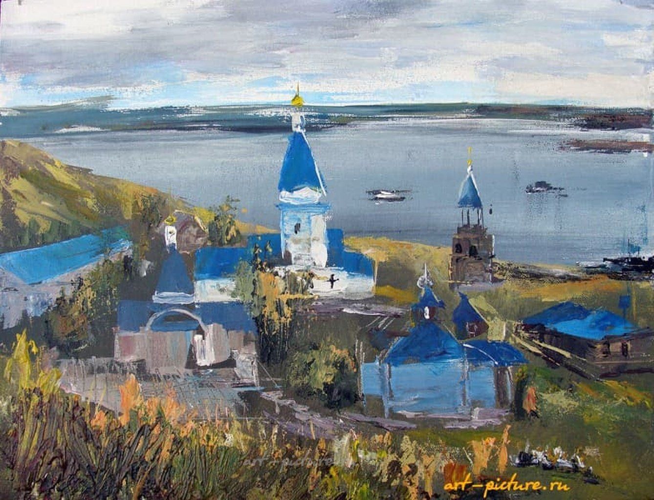 Как же красиво! Эти голубые купола на фоне спокойной реки прямо притягивают взгляд. Осенние цвета придают картине особую теплоту, а сочетание природы и религиозной архитектуры создает удивительное чувство умиротворения.