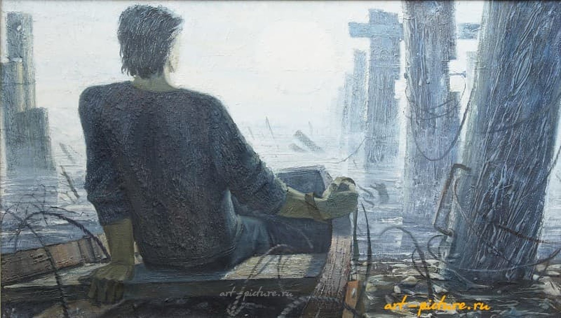 Какая сильная и чувственная картина! Фигура человека, погруженная в размышления среди разрушенных конструкций, символизирует одиночество и утрату. Холодная палитра и туманная атмосфера усиливают це трансцендентное чувство, заставляя задуматься о том, что осталось в прошлом и о будущем, которое еще не пришло.