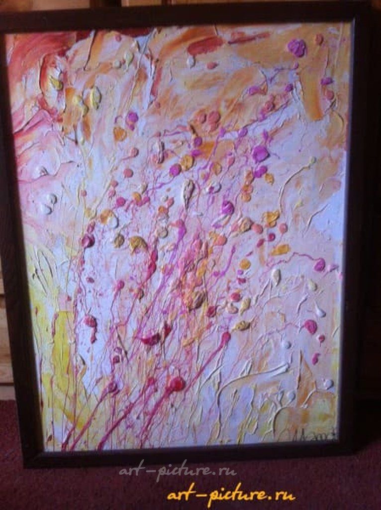 Сначала о картине. Эту абстрактную работу, выполненную в пастельных тонах, можно охарактеризовать как выразительный пример современного искусства. Нежные оттенки розового, желтого и белого создают гармонию и легкость, вызывают положительные эмоции. Такие цвета часто ассоциируются с романтикой и спокойствием, а оттенки пастели создают завершенный, гармоничный образ, что, согласись, очень приятно воспринимается. Когда смотришь на такую работу, возникает желание погрузиться в её мир, дать волю своим чувствам и интерпретациям.