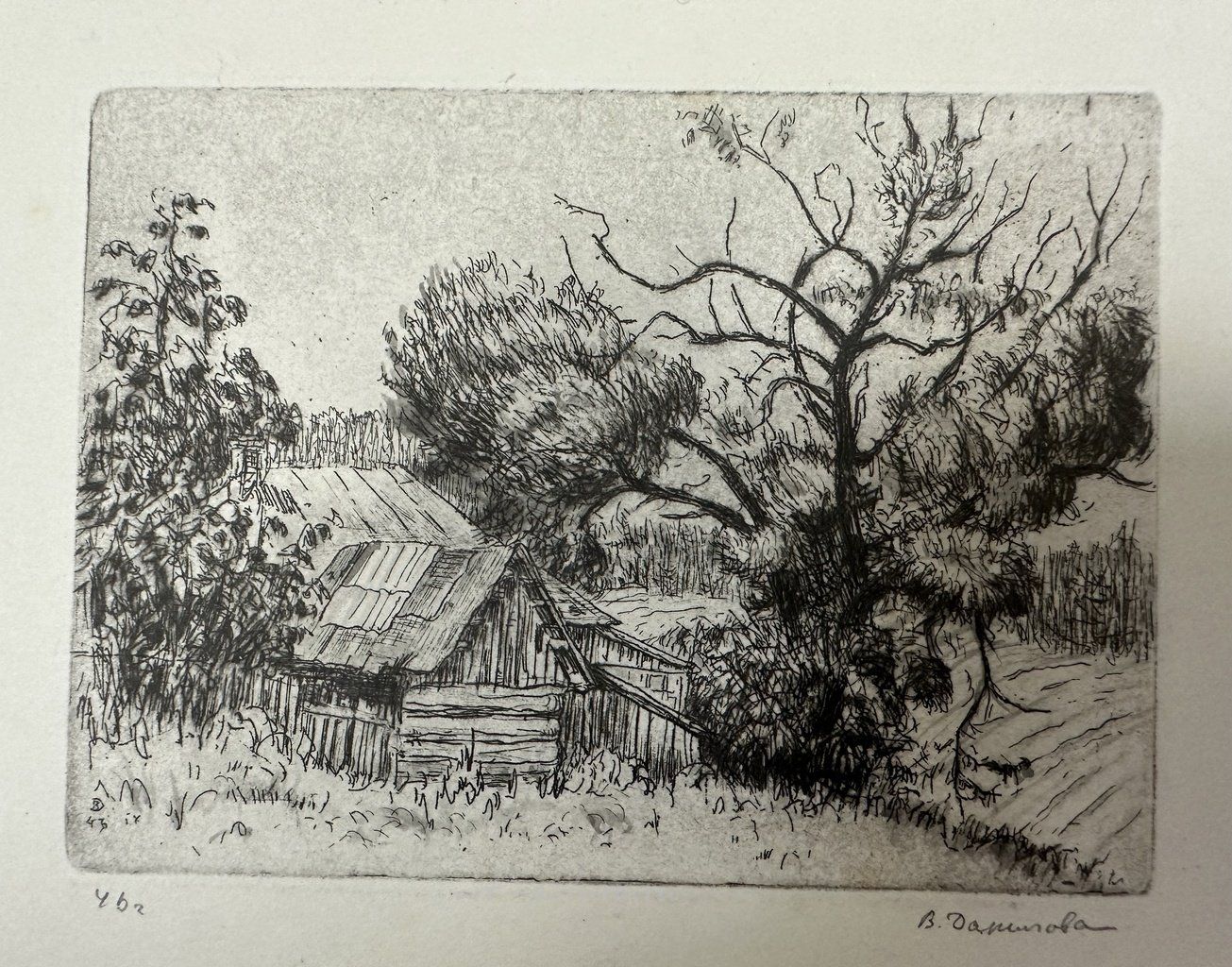 Данилова Валентина Васильевна (1906 - 1998 гг.). График. Училась в Тифлисе — в художественных студиях Б. А. Фогеля и М. И. Тоидзе (1920-е), Тифлисской Академии художеств (1928–1931) у Е. Е. Лансере, И. А. Шарлеманя. Жила в Москве. Была замужем за художником-графиком А. О. Дмитриевым. Работала преимущественно в технике офорта; пейзажист, автор тематических композиций, выполняла экслибрисы. Автор серий гравюр: «Ново-Девичий монастырь» (1942–1946), «Музей изобразительных искусств» (1948), «Дом на Никитской» (1949), «Киргизская сюита» (1955–1957, совместно с А. О. Дмитриевым); отдельных листов (в соавторстве с А. О. Дмитриевым): «Гоголь читает комедию “Ревизор” артистам Малого театра» (1951–1952), «Художник П. А. Федотов в Москве» (1952–1953), «Библиотека им. В. И. Ленина в Москве» (1956), «Чернышевский в ссылке среди революционеров» (1962), «Горький и Ромен Роллан» (1963). С 1931 — участница выставок (1-я отчетная выставка ударной бригады художников СОРАБИС Грузии в Тифлисе). Член Союза художников СССР. Экспонировалась на выставках: «Выставка офорта. 1934–1944» (1944), Всесоюзной художественной выставке (1952), «Н. В. Гоголь в произведения советских художников» (1952), гравюры и офорта (1953), произведений графики, скульптуры и керамики художников Московской области (1955), произведений 2-го Всесоюзного конкурса изобразительного и прикладного искусства учащихся и работников трудовых резервов (1956), 1-й выставке офорта московских художников (1956), эстампа московских художников (1957, 1960, 1961, 1966, 1967), «Москва социалистическая в произведениях московских художников» (1957), «Памятники древнерусской архитектуры в произведениях московских художников» (1966), «Памятники истории и культуры нашей Родины в произведениях московских художников» (1968) в Москве; выставке, посвященной Н. В. Гоголю (1952), офорта (1958) в Ленинграде; передвижной выставке произведений советских художников (1953, Небит-Даг, Ереван, Грозный, Ставрополь, Краснодар, колхозы Закавказья и Кубани); гравюры и офорта в Риге (1954) и других. Участник ряда выставок советского искусства за рубежом: в Варшаве (1946), Дамаске, Бейруте, Каире (1955, передвижная), Софии и Бухаресте (1956, передвижная). Провела персональные выставки в Москве (1944, 1947, совместно с А. О. Дмитриевым). Творчество представлено в ГМИИ им. А. С. Пушкина, Удмуртском Республиканском музее изобразительных искусств, Иркутском областном художественном музее им. В. П. Сукачева, Чувашском государственном художественном музее, Государственном музее искусств Казахстана им. А. Кастеева в Алма-Ате и других.БиографияДанилова Валентина Васильевна родилась в Петербурге. Ее отец, военный инженер, участвовал в строительстве Военно-Грузинской дороги и в 1919 году скончался от свирепствовавшей в то время эпидемии тифа. Валентина с матерью, оставшись без кормильца, случайно оказались в Сухуме и, воспользовавшись гостеприимством Алексея Евдокимовича Дмитриева, много лет прожили в его доме. Здесь прошли ее детские и юношеские годы. При выборе профессии повзрослевшая Валентина долго не могла решить, чем она будет заниматься в будущей жизни, архитектурой, или искусством. Победило последнее, но тема архитектуры присутствует в ее творчестве.В 20-х годах Валентина Данилова училась в Тифлисских художественных студиях Б. А. Фогеля и М. И. Тоидзе, в 1928 году поступила в Тифлисскую академию художеств под руководством Е. Е. Лансере и Н. А. Шарле
