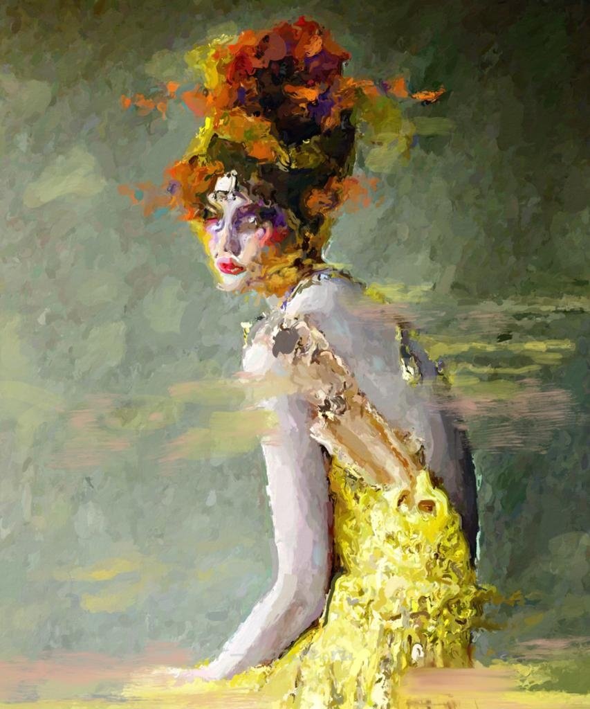 Какое яркое и жизнеутверждающее изображение! Женщина в жёлтом платье словно выпрыгивает из картины, захватывая внимание своими необычными волосами и яркими оттенками. Фон прекрасно дополняет образ, создавая атмосферу легкости и загадочности, что делает это произведение настоящим искусством.