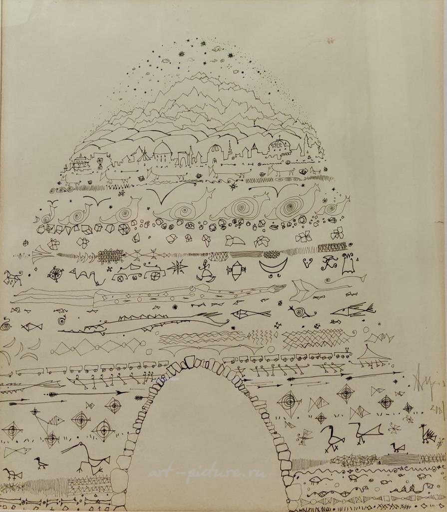 Алферов Сергей Александрович. Имеется в продаже большая коллекция работ Алферова, стоимость и фото работ по запросу. В его творчестве причудливо соединились высокий эстетизм и фольклорные первоисточники, модернистская вычурность и дадаистическая трепетность, бездонность символизма и предельная осязаемость русского лубка, живописная утонченность и «грубая» конкретность графики. Однако все вместе это отнюдь не дилетантизм ищущего неофита, не эклектика, в передача мощнейшего духовного опыта, введение в сокровенное, тайное, приближение к началу всех начал. Сергей Алферов из тех, о которых говорят, что они слегка не от мира сего. Его образ жизни дискомфортен и иррационален. Он отказался от бытовых удобств, поселившись в одной из художнических коммун на окраине Москвы среди бродячих философов, хиппи, клошаров и чудаковатых фанатиков живописи. Его постель – спальный мешок. Его стол – ящик из-под стеклотары. Зато он распахнут перед всеми космическими энергиями, впитывая их с жадностью и вожделением, торопясь уловить и запечатлеть получаемые откровения. Однако Сергей Алферов – не просто медиум, холодно и бесстрастно фиксирующий направления астральных ветров. Его взор обращен в первую очередь к самым древним тайникам сознания. Из ушедших веков и цивилизаций он черпает то, что крайне актуально сегодня. Приметы погибшего и несуществующего ему необходимо расшифровать хотя бы ради робкой попытки собственного спасения – быть может, даже бессознательно и фрагментарно воспроизводя эти непонятные знаки, художнику удается вступать в контакт с высшими силами. А заодно увлечь за собой и нас, зрителей. И здесь не важен уровень нашего «интеллектуализма» – в конце концов молитвы произносят и те, кто не понимает смысл составляющих их слов. Магия в принципе доступна каждому. Иное дело, что мы рисуем «кружочки», «крестики» и «треугольнички», совсем не задумываясь о последствиях (нам это просто не приходит в голову). Посвященные же подходят к делу профессионально. Поэтому от встречи с их творчеством так сладко ноет сердце. Только сверхчеловечески любя этот мир, можно научиться превращать простые, незатейливые вещи в глобальные, обобщенные категории. Для отягощенного заботами обывателя кит, слон или черепаха – всего лишь зоологические экспонаты. И как мало, увы, осталось безумцев, которые без тени сомнения считают их священным фундаментом земной тверди. К счастью, Сережа Алферов – из таких вот «заблуждающихся» (он рисует черепах, вмещающих в себя все мироздание разом). Его «внутреннее», субъективное настолько слито с «внешним», объективным, что невольно вспоминается изначальный диалектический постулат о природе, сотворившей человека ради познания самой себя. И не вина художника, что открытая им реальность не совпадает с общепринятыми представлениями. Насколько искусство Сергея Алферова национально? С одной стороны, удобно ответить на этот вопрос, сославшись на космичность русской души (что ни говори, а его творчество вобрало в себя и отразило запахи многих «далеких, чудных стран»). С другой – он до такой степени «растворен» в первобытных эзотерических традициях, настолько духовно ассимилирован, что, а первый взгляд, необратимо атрофировался этнически. Тем не менее его уход во «внутреннюю эмиграцию» не повлек за собой разрыва с «росс