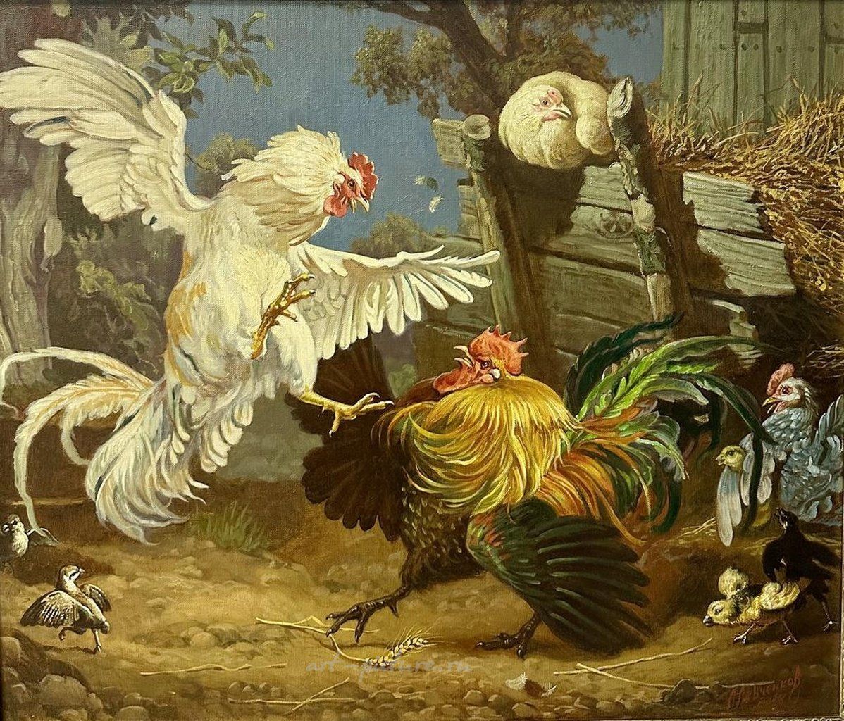 В данной картине, изображающей поединок двух петухов, возникает вопрос: не является ли этот бой метафорой более глубоких социальных конфликтов, которые мы наблюдаем в нашем обществе? Каковы параллели между агрессией в мире животных и конфликтами среди людей, и может ли искусство помочь нам осознать эти связи на интуитивном уровне?