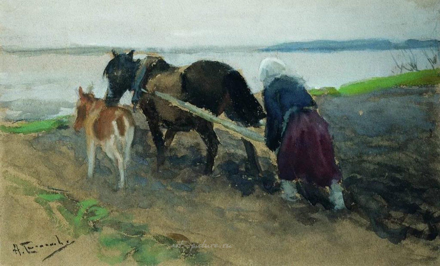 Как же приятно окунуться в мир искусства, рассматривая картину, где разигрывается сама жизнь. На этом произведении мы видим удивительный сельский пейзаж: тихая река спокойно течет на заднем плане, словно подчеркивая величие природы, которой завидует даже время. И вот справа – женщина в красивой длинной юбке и светлом головном платке, ведет пару лошадей и корову, прикрепленных к плугу. Это момент, наполненный трудолюбием и гармонией, завораживает и заставляет задуматься о том, как тесно связана жизнь человека с материей, с землей.