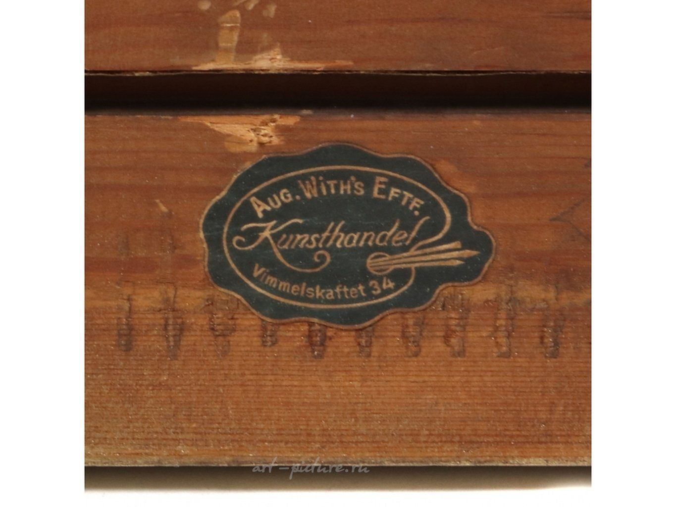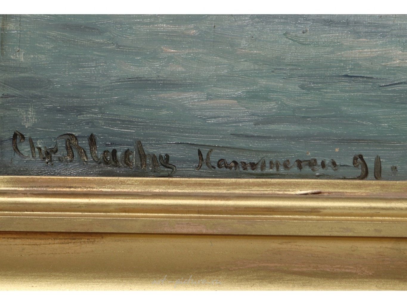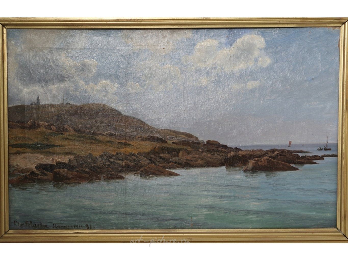 Каpтинa "Bид нa Борнхольм". Холст, масло. Дания, 1891 год Художник: Христиан Вигилиус Блахе (1838-1920). Картина подписана художником. Внешние размеры рамы: 75,5 х 51 см. Размеры изображения: 68,5 х 38 см. Раinting "Viеw оf Воrnhоlm". Саnvаs, оil. Dеnmаrk, 1891. Аrtist: Сhristiаn Vigilius Вlасhе (1838-1920). Тhе раinting is signеd by thе аrtist. Ехtеrnаl frаmе sizе: 75.5 х 51 сm. Imаgе sizе: 68.5 х 38 сm. На картине изображен морской пейзаж в штиль на восходе солнца. На первом плане - гладь воды. На среднем и дальнем плане – камни и лодки. Живописное письмо свободное, тонким слоем краски, более детализированное в изображении кораблей и более пастозное в участках белил. Борнхольм - остров в юго-западной части Балтийского моря. Экспертируемая картина написана на тонком, плотном фабричном хосте полотняного переплетения с грунтом машинной прокатки. Грунт голубовато-серого цвета. Техника исполнения не противоречит датировке картины концом XIX - началом ХХ века. Подпись в левом нижнем углу: Chr. Blache. — написана чёрной краской по просохшему живописному слою. Датский художник Христиан Вигилиус Блахе (1838-1920) известен как живописец-маринист. Блахе учился в Кораблестроительной Школе в Копенгагене, затем продолжил учёбу в Копенгагенской Королевской Академии художеств, где в 1861-1867 годах занимался в классе художника-мариниста Карла Фредерика Серенсена (Carl Frederik Sörensen, 1818-1879). С 1863 по 1920 год регулярно демонстрировал свои работы на весенних академических выставках во дворце Шарлоттенборг в Копенгагене, где в 1865, 1869 годах его картины были удостоены премии Нойхаузена, а в 1866, 1867, 1872 годах награждались медалями. С целью совершенствования художественного мастерства в 1872 году Блахе совершил путешествие по Западной Европе, посетил Нидерланды, Бельгию, Францию, Италию, Австрию (Вену), Германию (Дрезден, Берлин). В 1878 году побывал в Париже. В 1887 году путешествовал по Исландии. В 1887, 1888 годах награждался за свои произведения медалями Эккерсберга. В 1888 году Блахе становится членом копенгагенской Королевской Академии художеств и в 1890 году избирается в Совет Академии, а его картину «Бухта Бергтруп» приобретают для Королевского музея живописи. С 1898 года - профессор, с 1892 по 1914 - директор копенгагенской Королевской Академии художеств. В 1907-1914 годах директор академических выставок в Шарлоттенборге. Блахе принимал также участие в международных выставках в Париже (1878, 1889) и Чикаго (1893). Х. Блахе принадлежит кругу мастеров, которые одними из первых стали работать на натуре в Скагене, самой северной точке острова Ютландия, где в конце 1870-х годов сформировалась колония художников. Произведения Христиана Блахе, написанные с реалистической достоверностью, по преимуществу посвящены морским просторам и прибрежным видам родной страны - Дании. Он предпочитал писать бурное море, передавая динамику морской стихии. Однако, начиная с 1890-х годов, среди его работ появляются полные гармонии и покоя морские вилы с романтическими эффектами утреннего или вечернего освещения. Экспертируемая картина относится к этой группе произведений. Близкие экспертируемой картине композиционные, живописные и стилистические решения встречаются в таких работах Х. Блахе как «Прибрежный пейзаж с двумя парусными лодками» (имеет подпись художника и дату - 1894 год, холст, масло, 35 × 27 см, частное собрание, Копенгаген, 2010); «Фрегат Ютланд и другие суда» (имеет подпись художника, холст, масло, 3