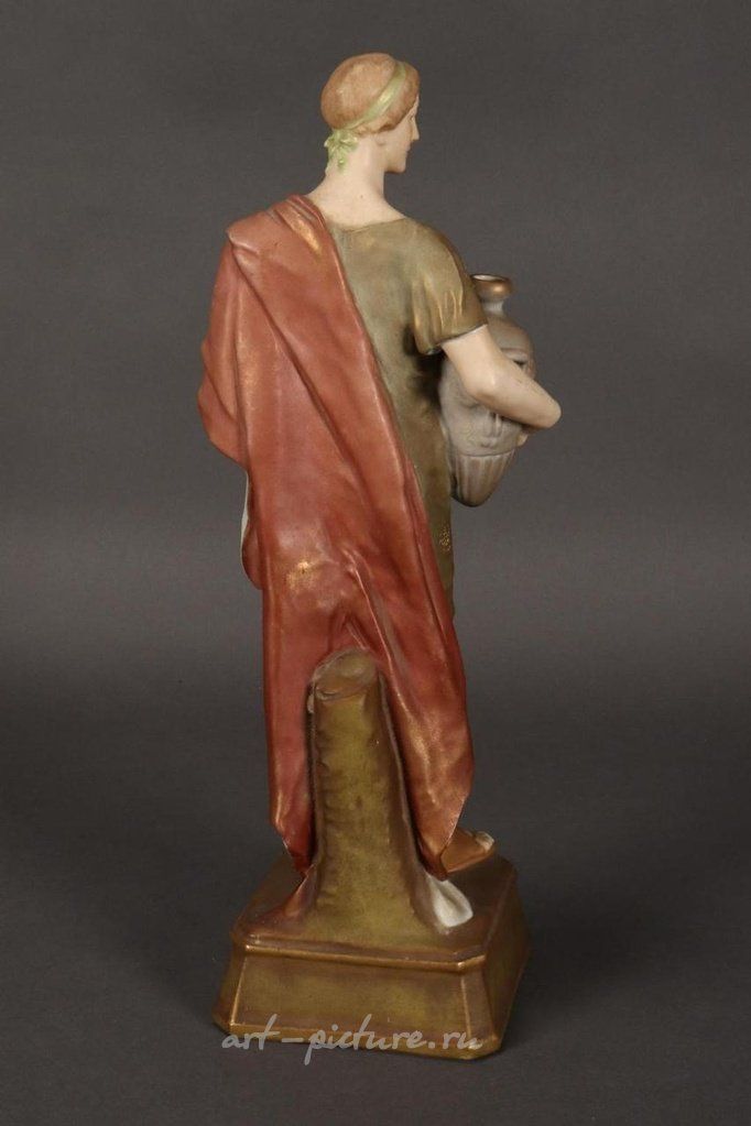 "Носильщик воды" - это изображение молодого человека в классической одежде, который несет амфору. Вся композиция выполнена в зеленых, красных и позолоченных тонах и размещена на квадратном основании. Высота этой композиции составляет 42 см.