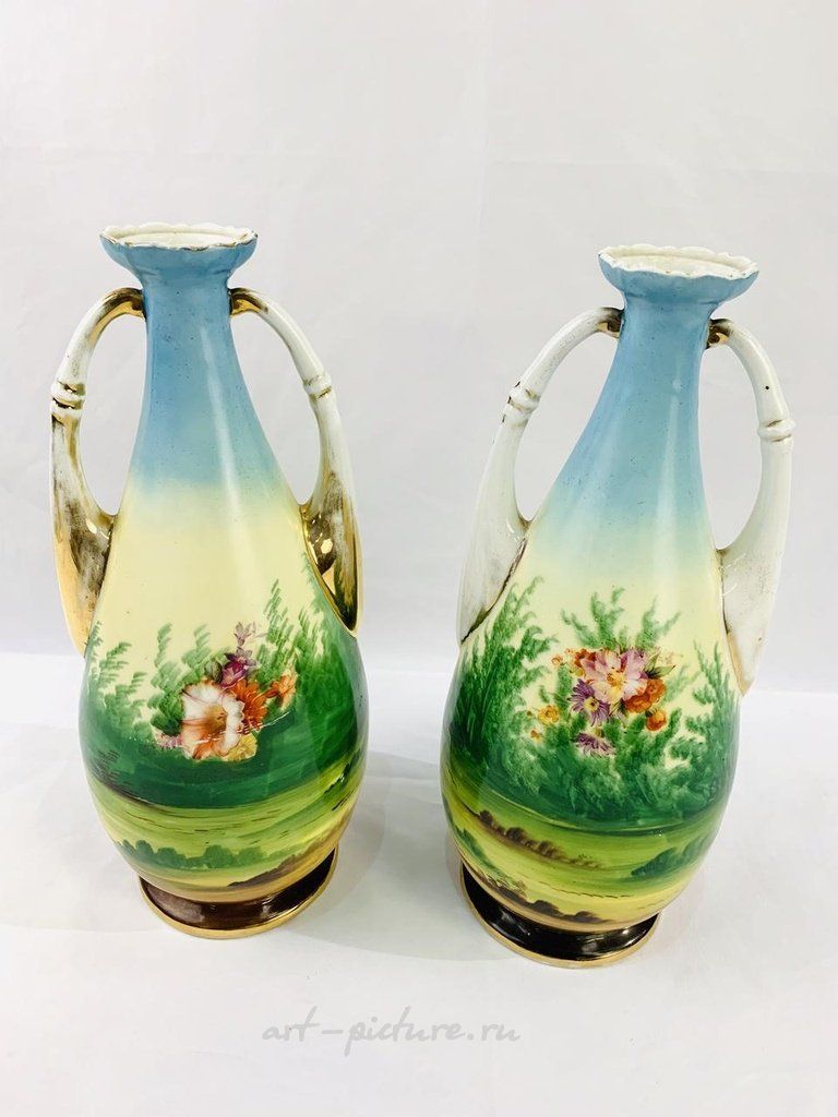 Предлагается пара больших двуручных ваз Royal Vienna в стиле 19 века с изображениями в рельефе. Оценивается в сумму от £30 до £50.