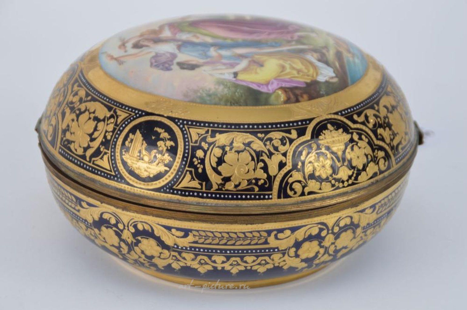 КОРОБКА ИЗ РОСКОШНОЙ ВЕНСКОЙ ФАРФОРОВОЙ КЕРАМИКИ РУЧНОЙ РОСПИСИ с изображением "Трех Граций" и позолоченными интерьером. Состояние: отсутствуют трещины и сколы, сломана петля. Размеры: 8 х 4,75 дюйма.