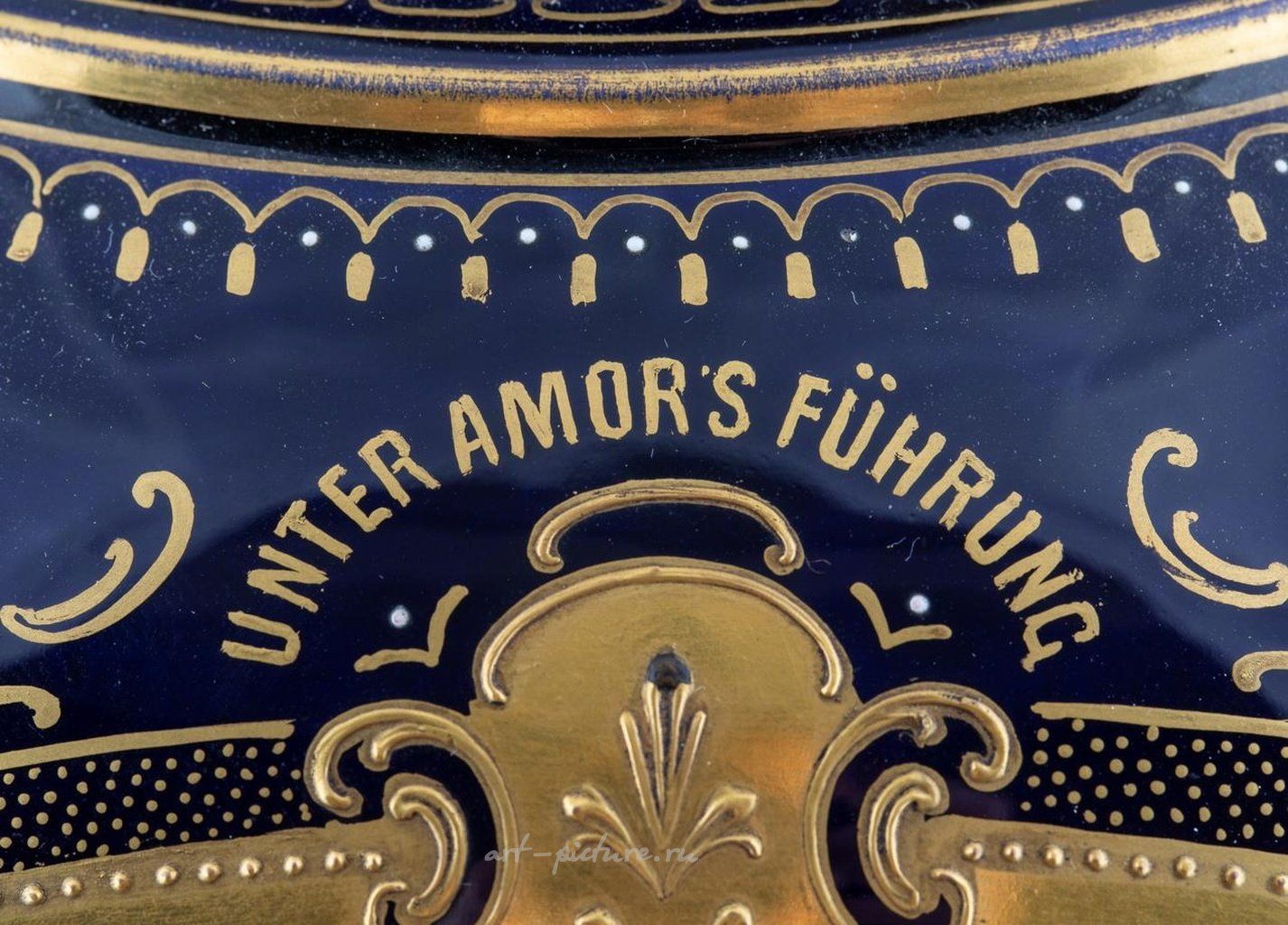Фарфоровая венская ваза в стиле Эпануссеман, созданная по мотивам Анжело Асти, конец 19-начало 20 века, имеет балюстровую форму с двумя ручками, выполненными в виде головы мужчины. Портрет в золоченом картуше изображает брюнетку красавицу Эпануссеман, которая сидит в профильном бюсте, покрытом розовым тюлем, на темно-зеленом фоне. Корпус украшен золотым антемионом, который продолжается по тонкому горлышку и основанию, а все это на кобальтовом фоне, на лестничной ступени прямоугольного пьедестала, увенчанного панелями букетов антемионов. Ваза также имеет крышку, завершенную гладким финиалом. Общая высота составляет 55 см (21 5/8 дюймов). Состояние вазы пожилое. Присутствует незначительная потертость золотых ручек и общая пыльность поверхности. При проверке при помощи УФ-освещения обнаружена реставрация на тонком основании.