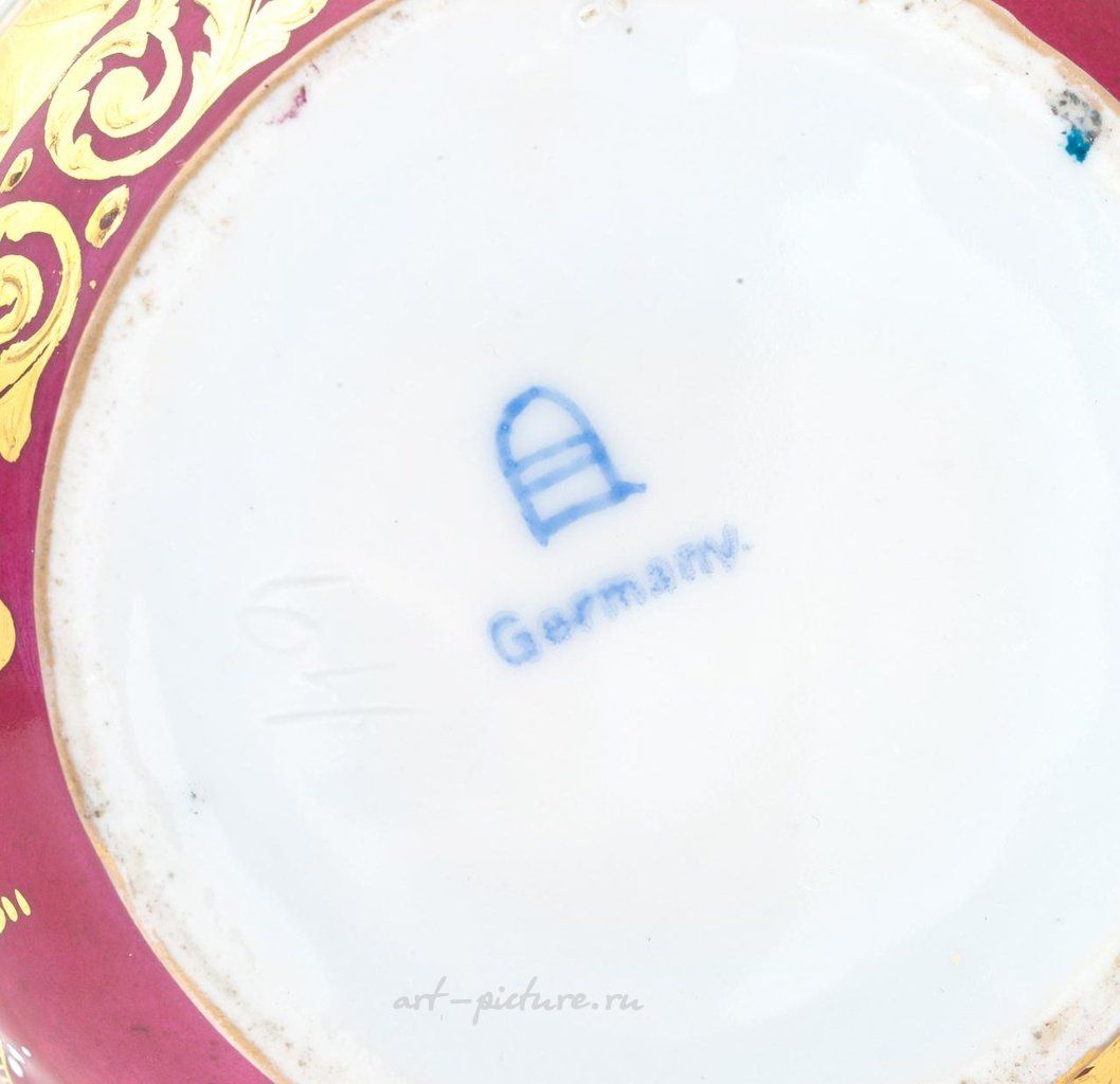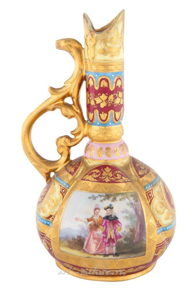 Маленький немецкий золотистый кружковой фарфоровый кувшин конца XIX века имеет овальную форму с зауженной шейкой и рукояткой в виде листьев. На корпусе кувшина изображены две сцены влюбленных, каждая расположена в золотистой карточке. Зауженная шейка украшена изображением виноградной лозы, растительных мотивов и акантовых резных узоров. Кувшин имеет фирменную марку "Royal Vienna" с голубой подсветкой и надписью "Германия". Общая высота кувшина составляет 17 см (6 3/4 дюйма). Кувшин находится в очень хорошем оригинальном состоянии. Наблюдается незначительное стирание золотистых деталей, особенно вокруг основания. При осмотре под УФ-лучами не обнаружено явных признаков реставрации или ремонта. Обратите внимание, что все лоты продаются в состоянии, в котором они находятся на момент продажи. Утверждения о состоянии произведений искусства предоставляются в качестве любезности для наших клиентов с целью помочь им оценить состояние. Рапорт представляет собой искреннее мнение Shapiro Auctions и не должен рассматриваться как заявление факта. Отсутствие описания состояния или фотографии не гарантирует отсутствие дефектов или реставрации, а также ссылка на определенные дефекты не означает отсутствие других. Shapiro Auctions, LLC., включая своих консультантов и агентов, не несет ответственности за ошибки или упущения.