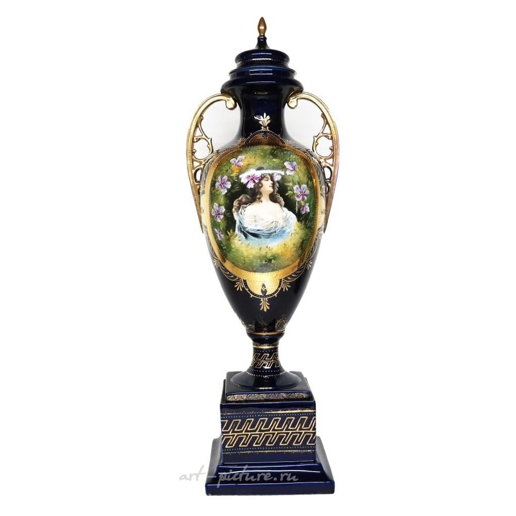 На фарфоре присутствует эмаль и позолота. Он декорирован портретом женщины, выполненным в виде панели на квадратной основе. Изделие состоит из двух частей и имеет размеры 31 см в высоту, 8 см в ширину и 8 см в глубину.