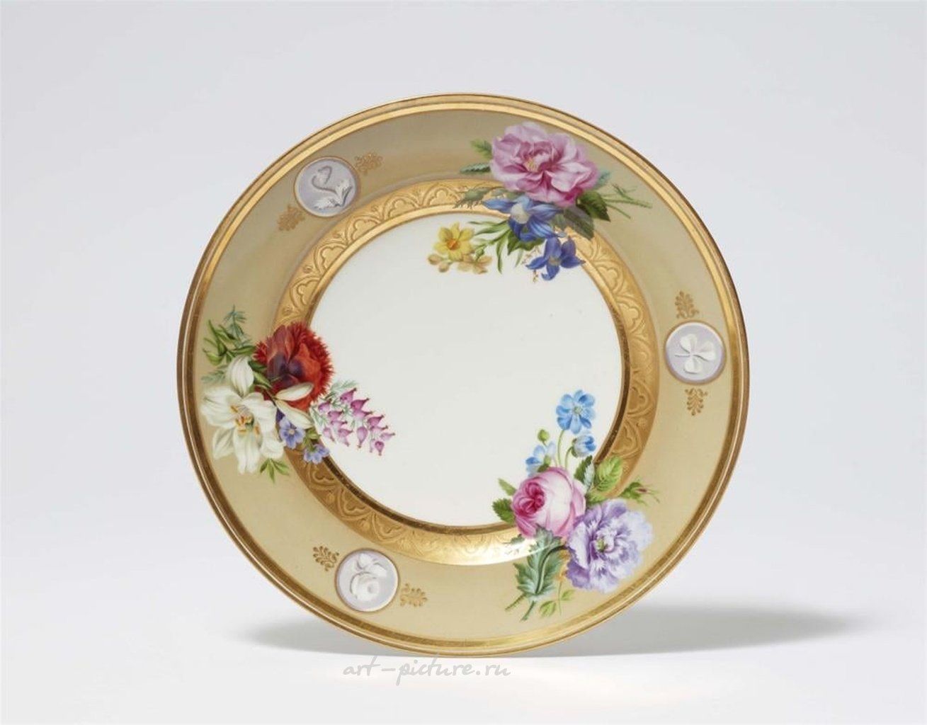 Граница нарисована с тремя реалистичными букетами цветов. В данном предложении нет грамматических ошибок или ошибок в падежах и лексике. Текст соответствует тематике "Фарфор".