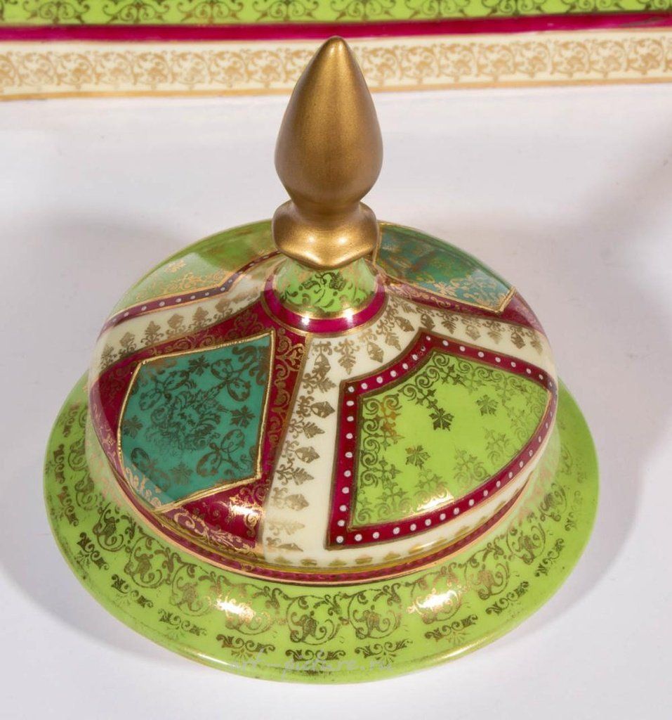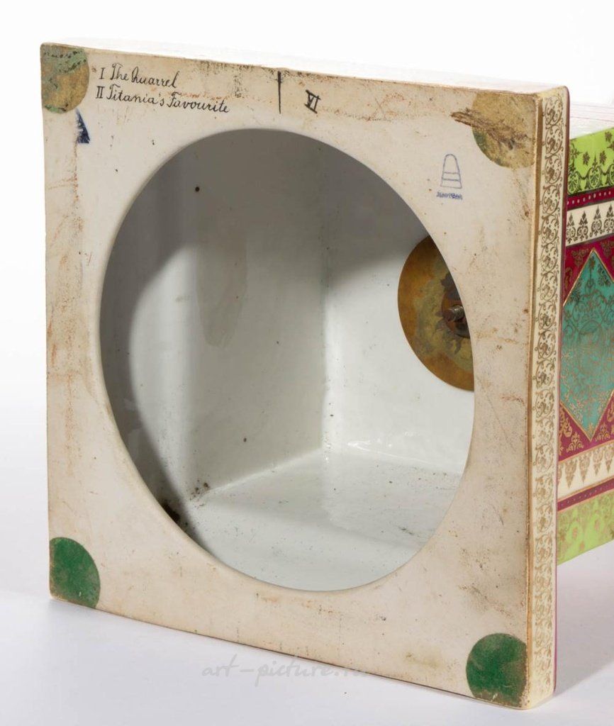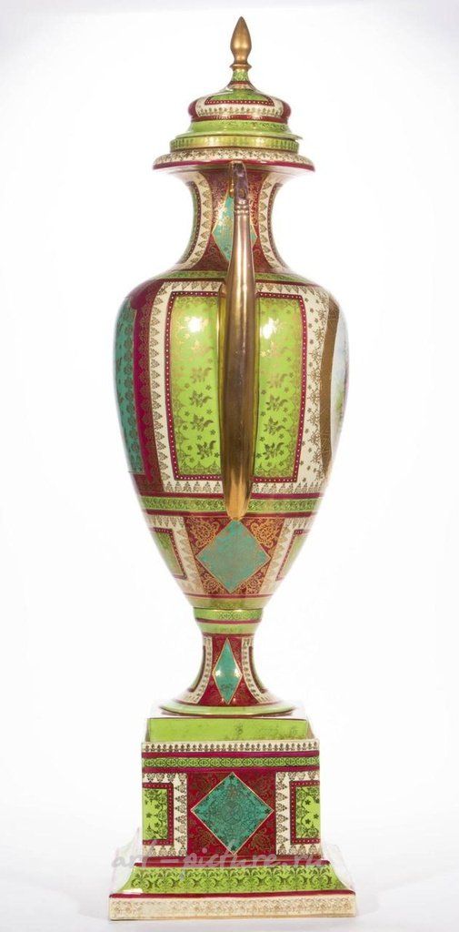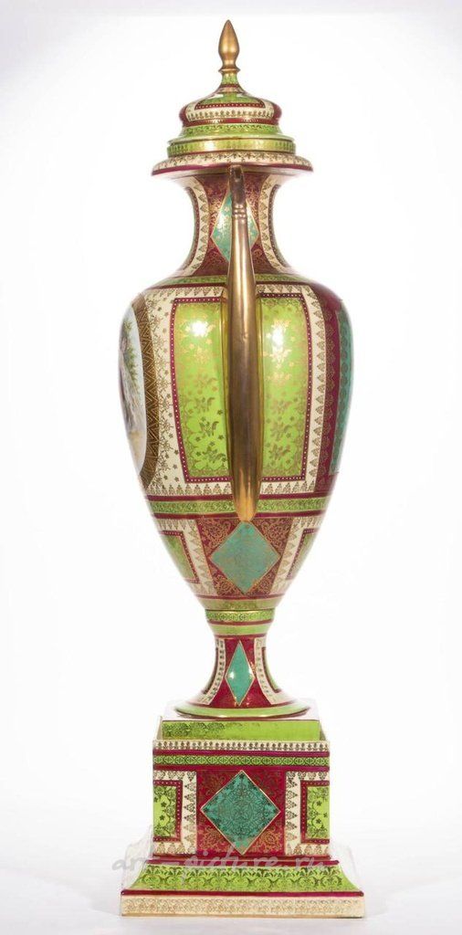 Австрийская королевская фарфоровая ваза из Дома Вены с крышкой представляет собой трехсекционную композицию на квадратном пьедестале. Ваза выполнена вручную и имеет центральный романтический резерв, изображающий красивую фигуру, носящую корону, женщину, играющую на лире, и херувима между ними. В нижней части вазы изображены почти обнаженные фигуры: две женщины и херувим. Декорации из золота на фоне известково-зеленого, глубоко-розового, бирюзового и кремового цветов придают урне роскошный вид. Марки на обратной стороне включают ручные надписи "I The Quarrel / II Titania's Favourite" и "VI" с синей пчелой, ниже которой написано "АВСТРИЯ". Ваза изготовлена на Имперской и королевской фарфоровой мануфактуре в Вене, Австрия.
