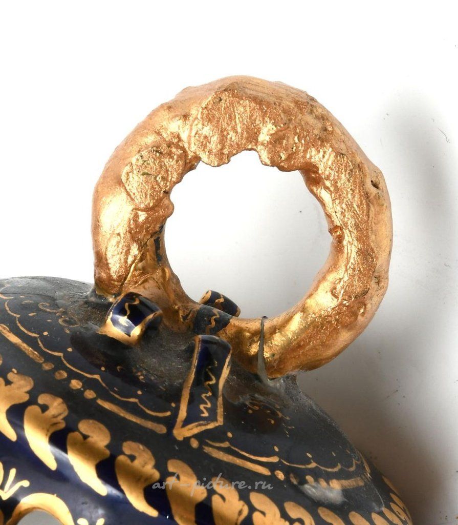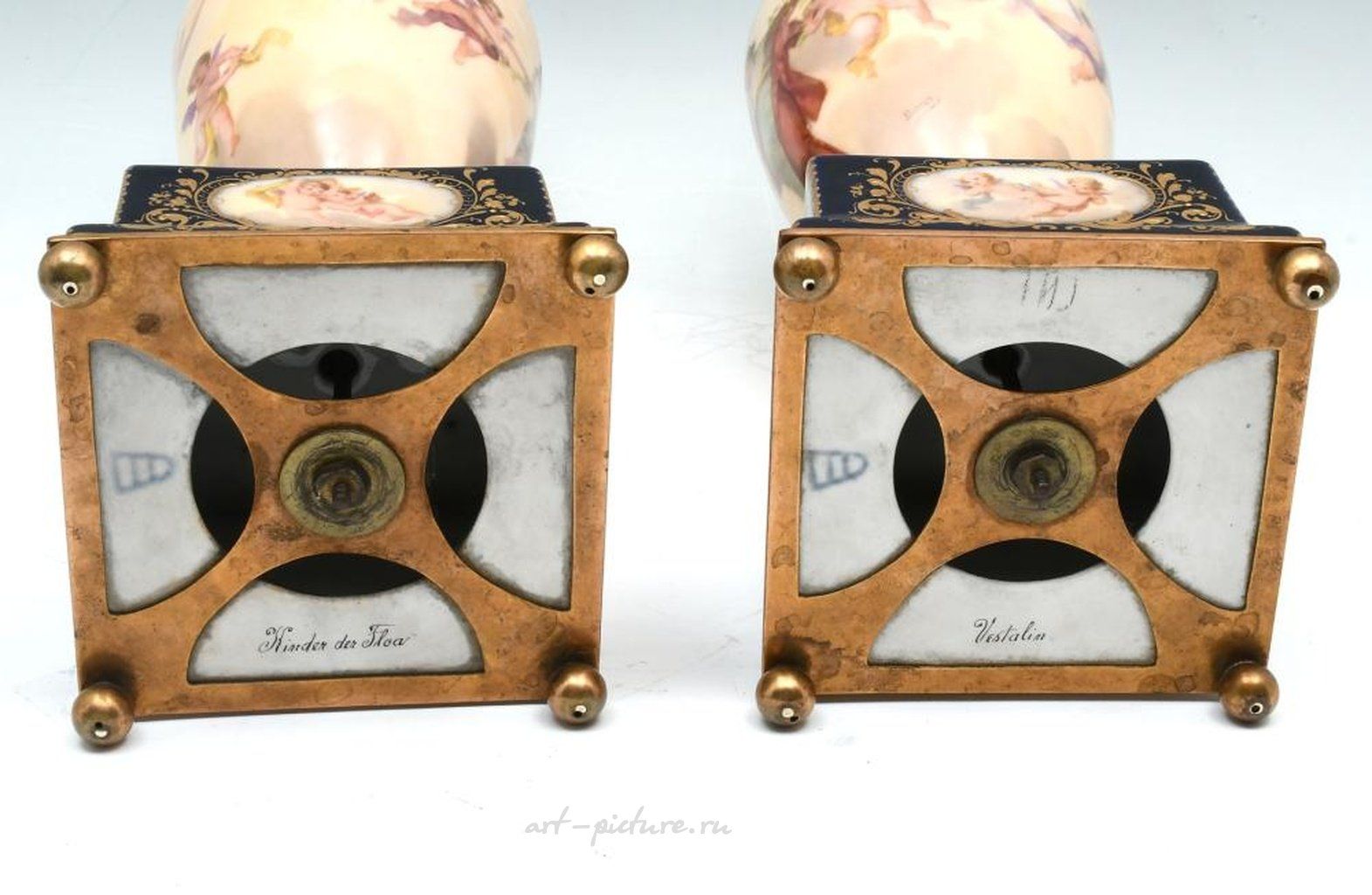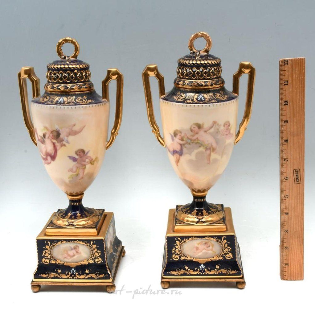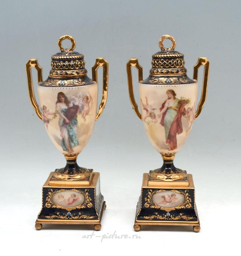 2 КОРОЛЕВСКИХ ФИГУРНЫХ КУБКА: 2 двуручные урны с изображением женщин, держащих корзины с цветами и херубинами, украшенные листовидными виноградными лозами. Верхушки сетчатых крышек имеют форму венца. На нижней стороне находится синий маркер в виде пчелиного улья и надпись на немецком языке. Одна из урн имеет надпись "Veatalin", а другая - "Hinder der flora". Приблизительные размеры: высота 13,75 дюйма, длина 6 дюймов, ширина 4,75 дюйма.