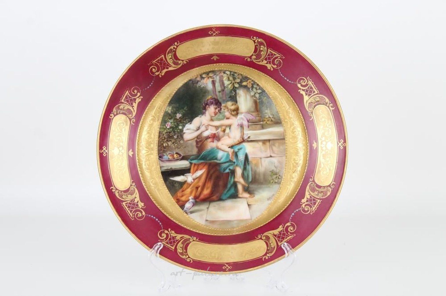 Античная ручная роспись на китайской фарфоровой тарелке Королевской Вены. С обратной стороны имеется клеймо с королевской пчелой. Тарелка подписана в нижней правой части изображения. Диаметр: 9,5 дюймов.