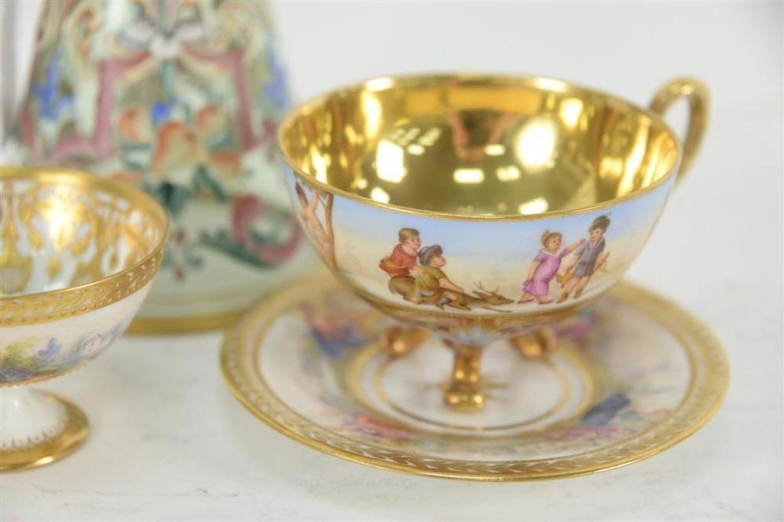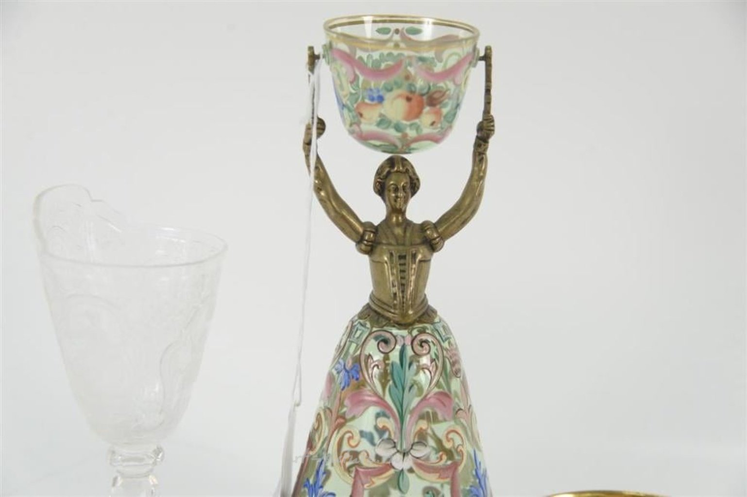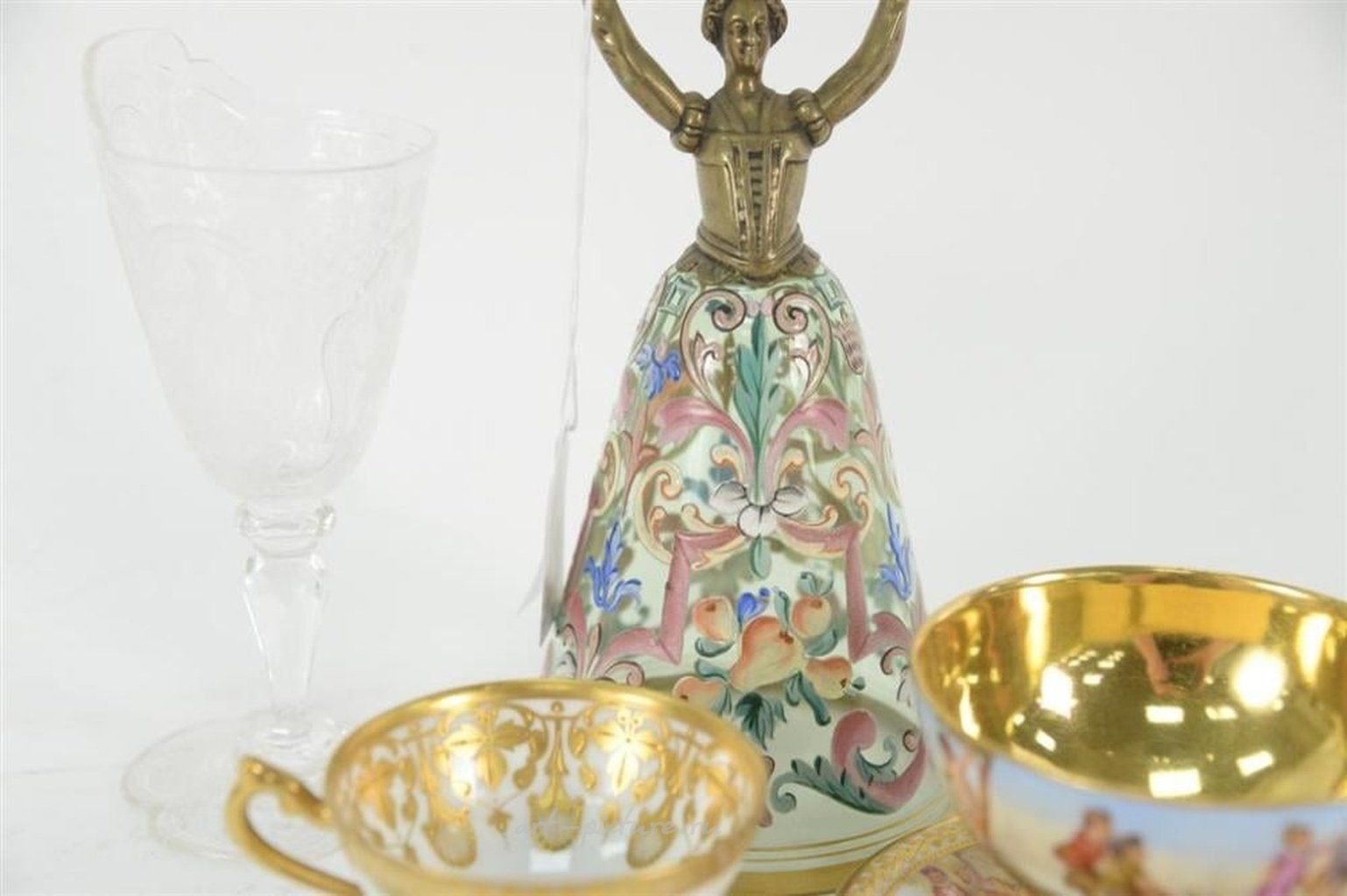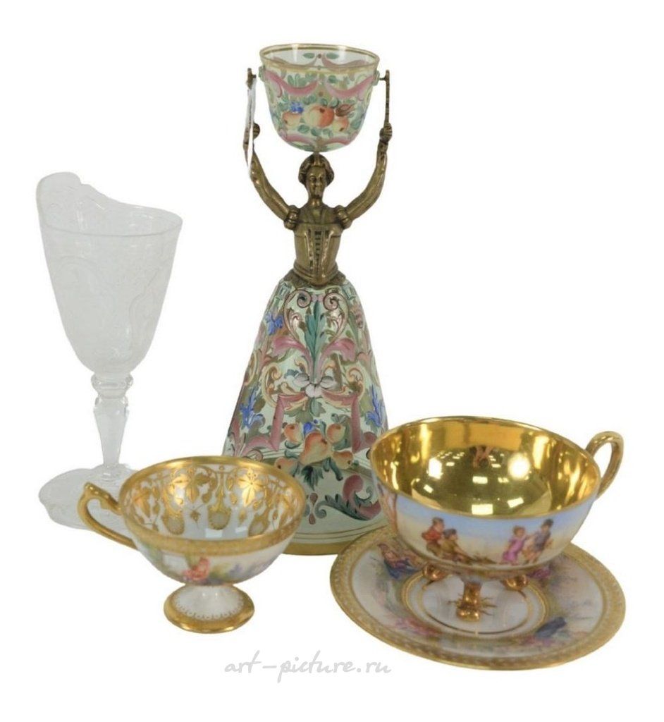 Пятипредметный ассортиментный набор включает в себя дрезденскую чашку с блюдцем, королевскую венскую чашку, гравированную кристальную ножку, а также свадебную чашу с эмалированной фигурой из латуни высотой 8 1/2 дюйма.