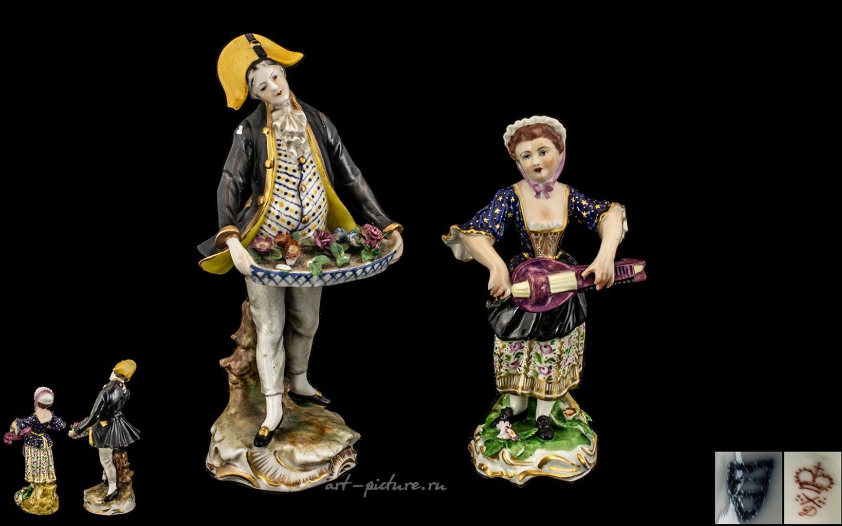 Дерби. Маленькая ручная роспись из XIX века. Фигурка молодой девушки, играющей на лире. Внизу есть маркировка "Дерби". Около 1876-1890 годов. Высота - 13,75 см (5,5 дюйма). Также имеется маленькая ручная роспись фарфоровой фигуры в костюме XVIII века по мотивам Королевской Вены. Она держит большую корзину с цветами. Внизу есть пчелиная маркировка. Высота - 17,5 см (7 дюймов). Состояние A/F (с дефектами).