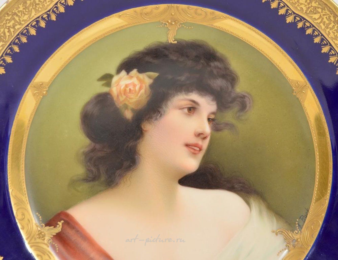 Портретная тарелка из королевской Вены имеет изображение женщины с розой в волосах. Она имеет золоченый и кобальтово-синий ободок и диаметр 9,5 дюйма. На нижней стороне тарелки находится марка пчелиного улья Вены. Есть подпись "Бок" на правом внутреннем краю. Состояние тарелки хорошее, однако есть небольшой скол на задней стороне края и некоторое облазание краски и золота по краям. Пожалуйста, внимательно изучите все фотографии для получения более детальной информации. Если у вас возникнут вопросы, обратитесь в галерею аукционов C. Biddle. Приобретая товары на аукционе, учтите, что галерея аукционов C. Biddle не несет ответственности за возможные ошибки или упущения в лотах. Все продажи являются окончательными и совершаются "как есть". Доставка товара возможна только внутри страны и стоимость составляет 35,00 долларов, к которым добавляется 2% от общей стоимости за страховку.